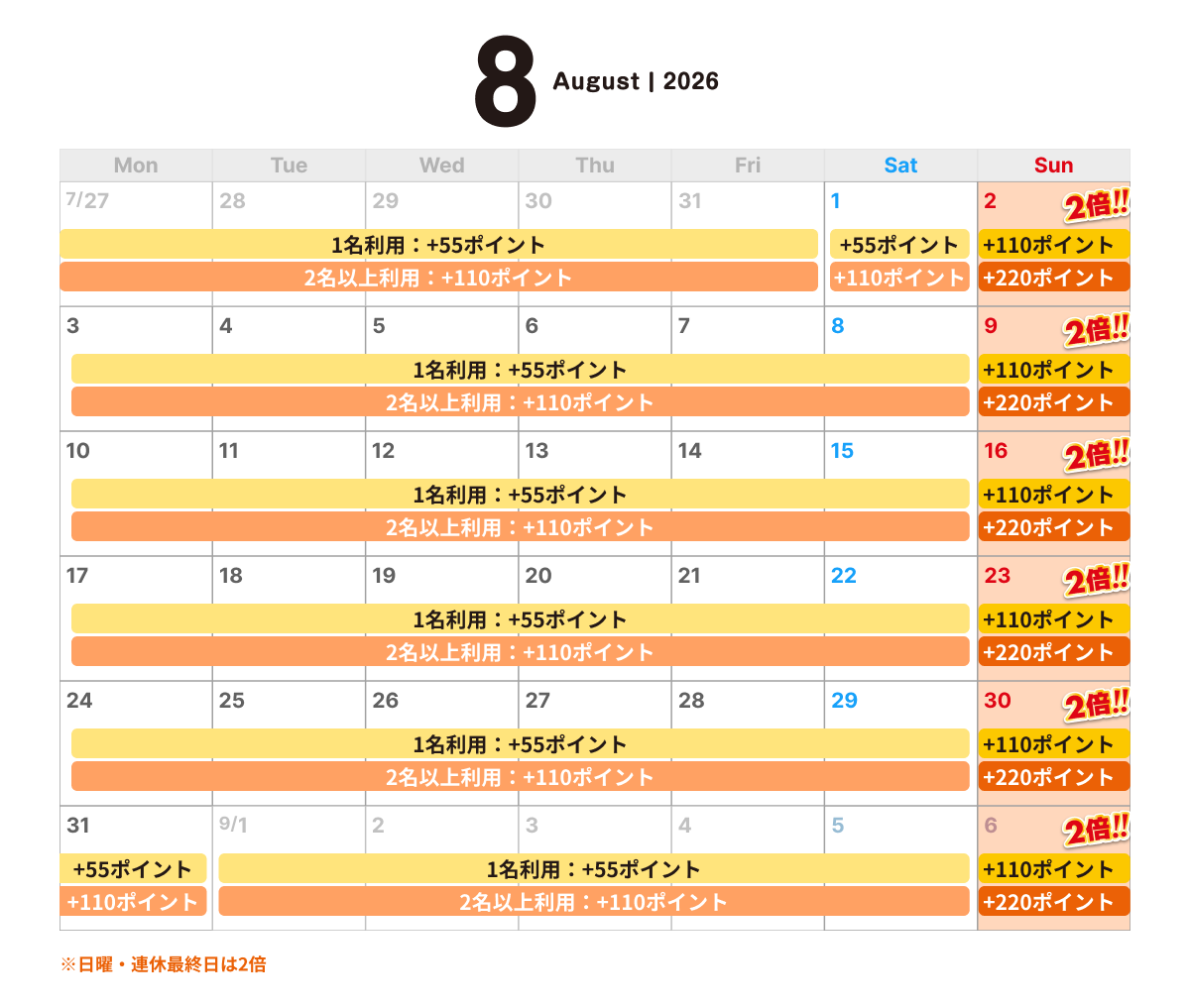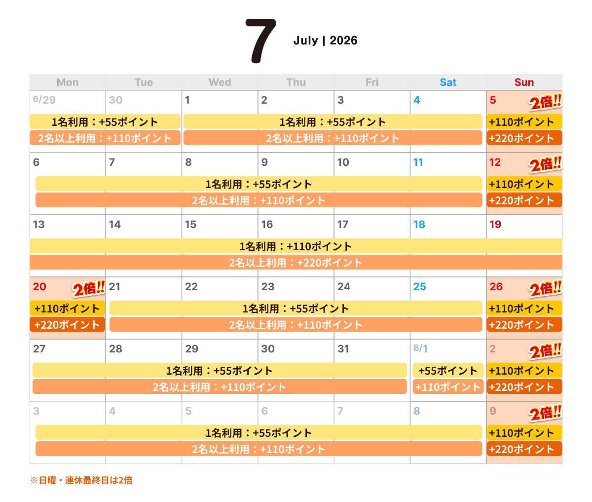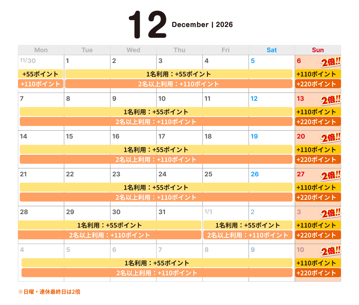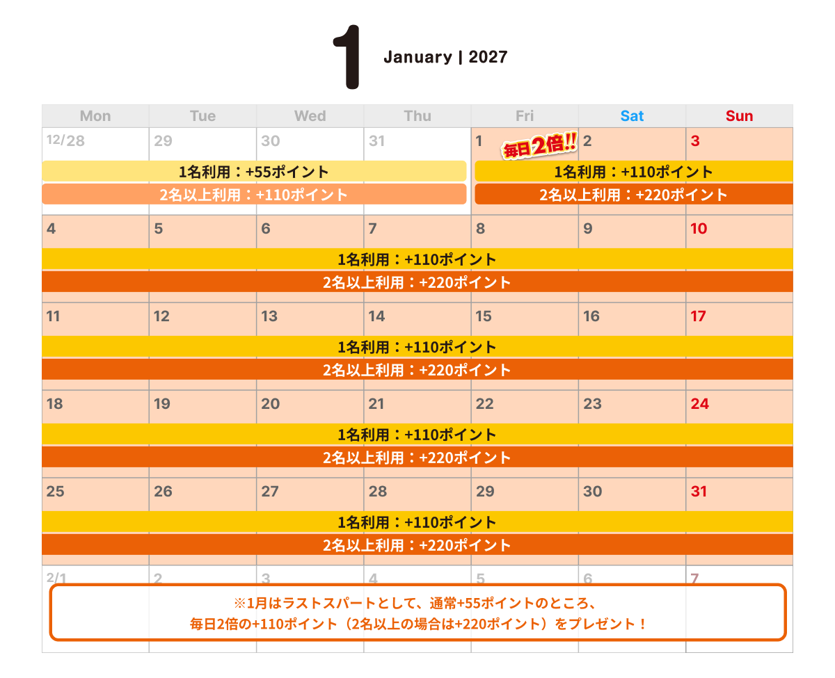 2名様以上利用の場合、もしくは日祝(連休最終日)※2、