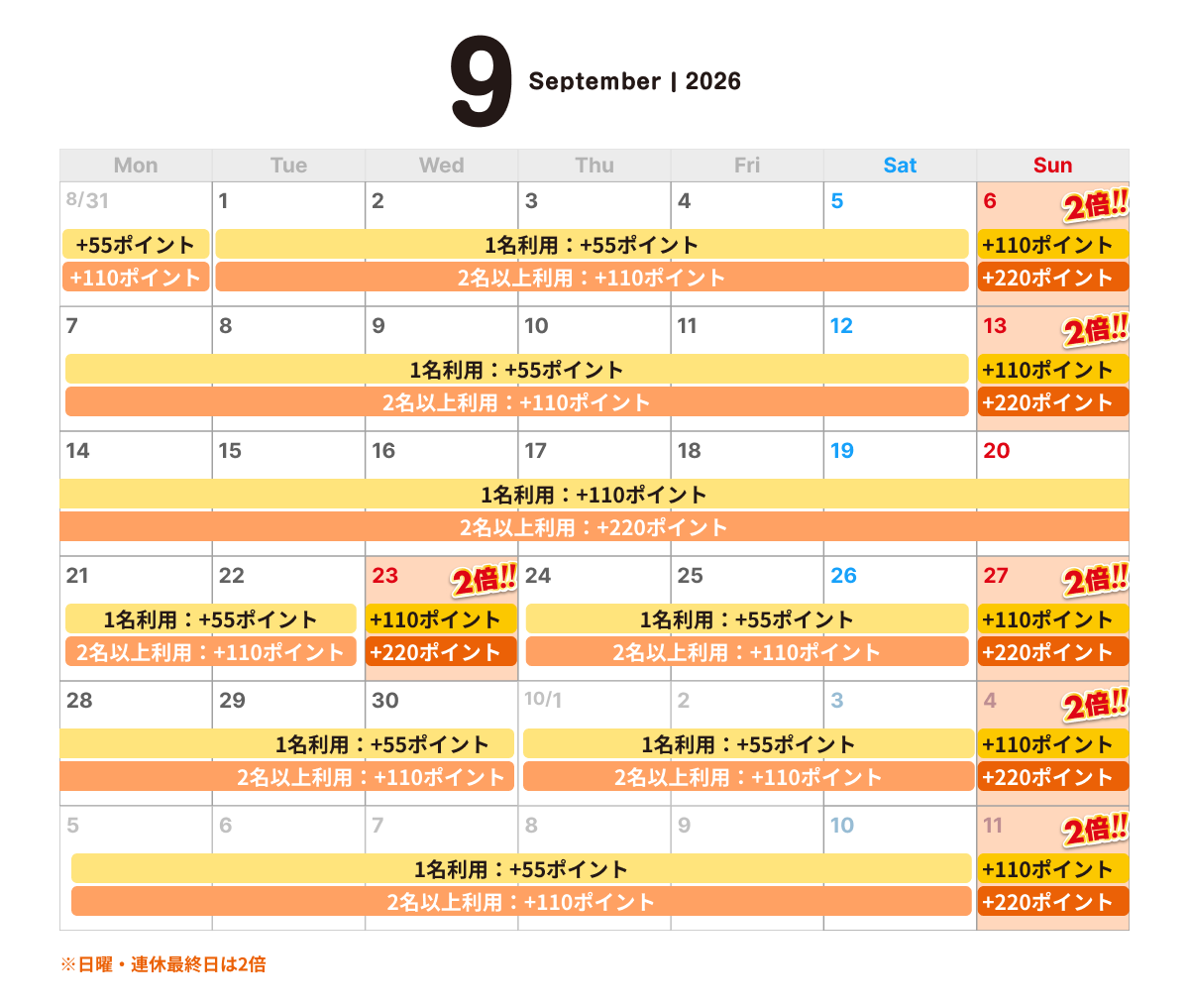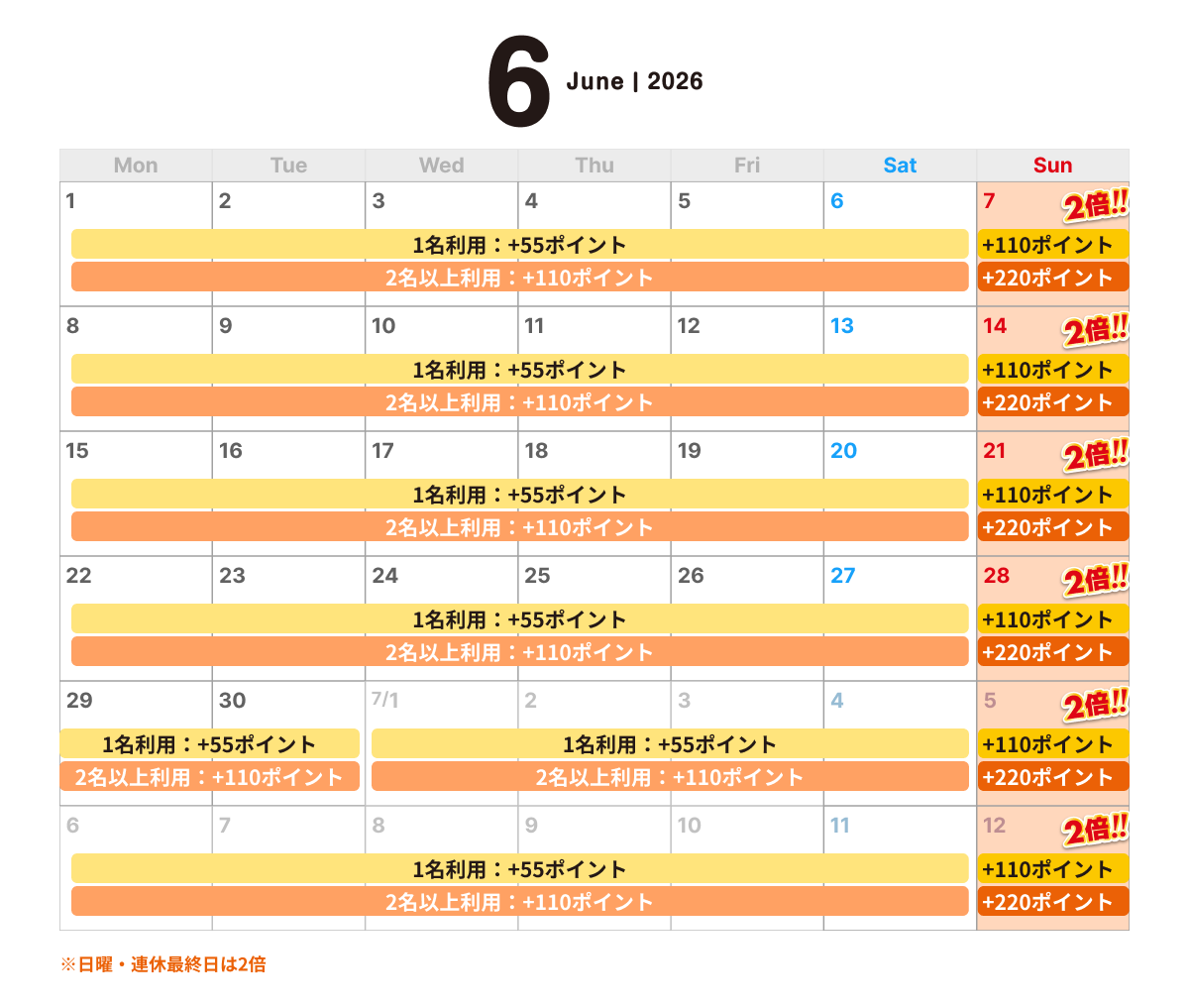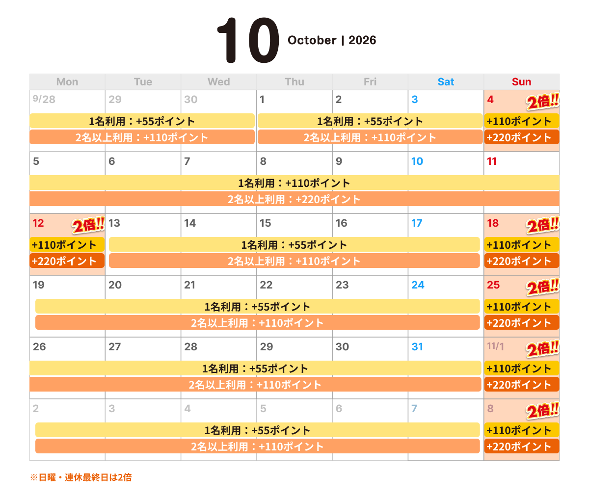 2名様以上利用の場合、もしくは日祝(連休最終日)※2、