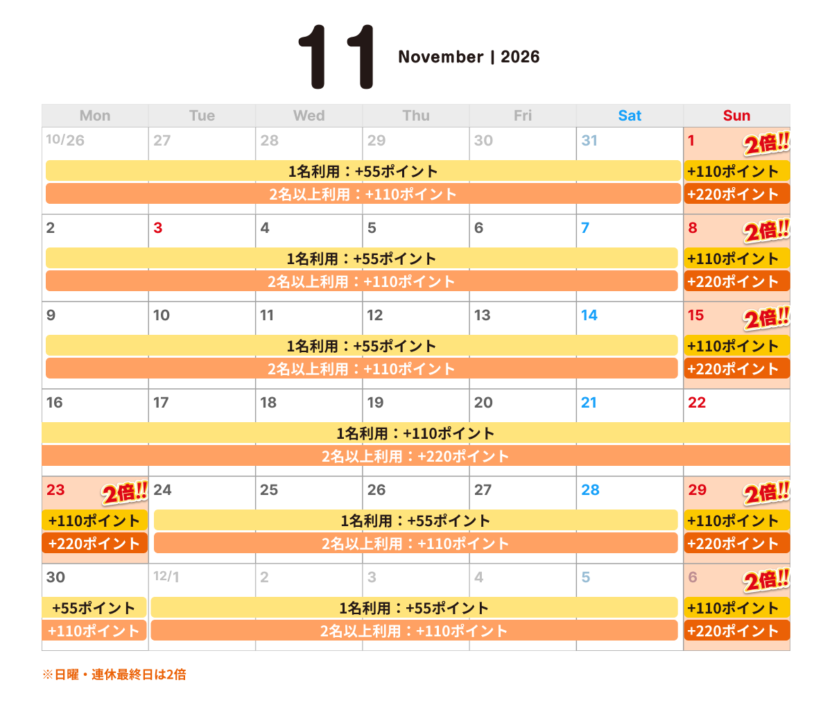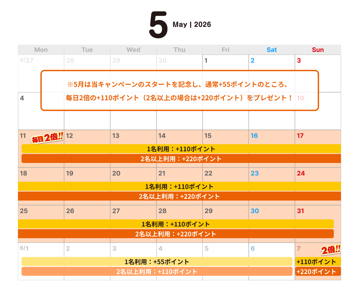 ※3 2名様以上で日祝(連休最終日)ご宿泊の場合は220pt付与となります。