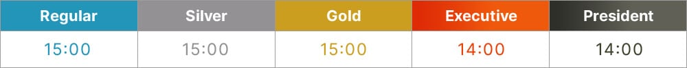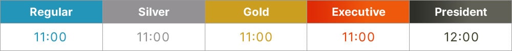 通常のチェックアウト時刻は10:00ですが、レギュラー会員からエグゼクティブ会員までは11:00、プレジデント会員は12:00まで無料延長いたします。