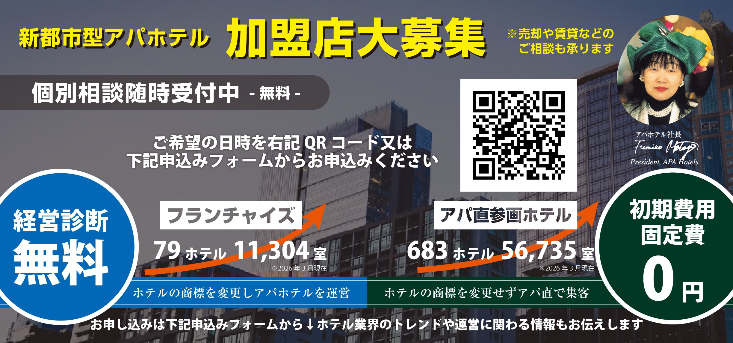 アパホテルのフランチャイズ、アパ直参画ホテルの募集をしています。