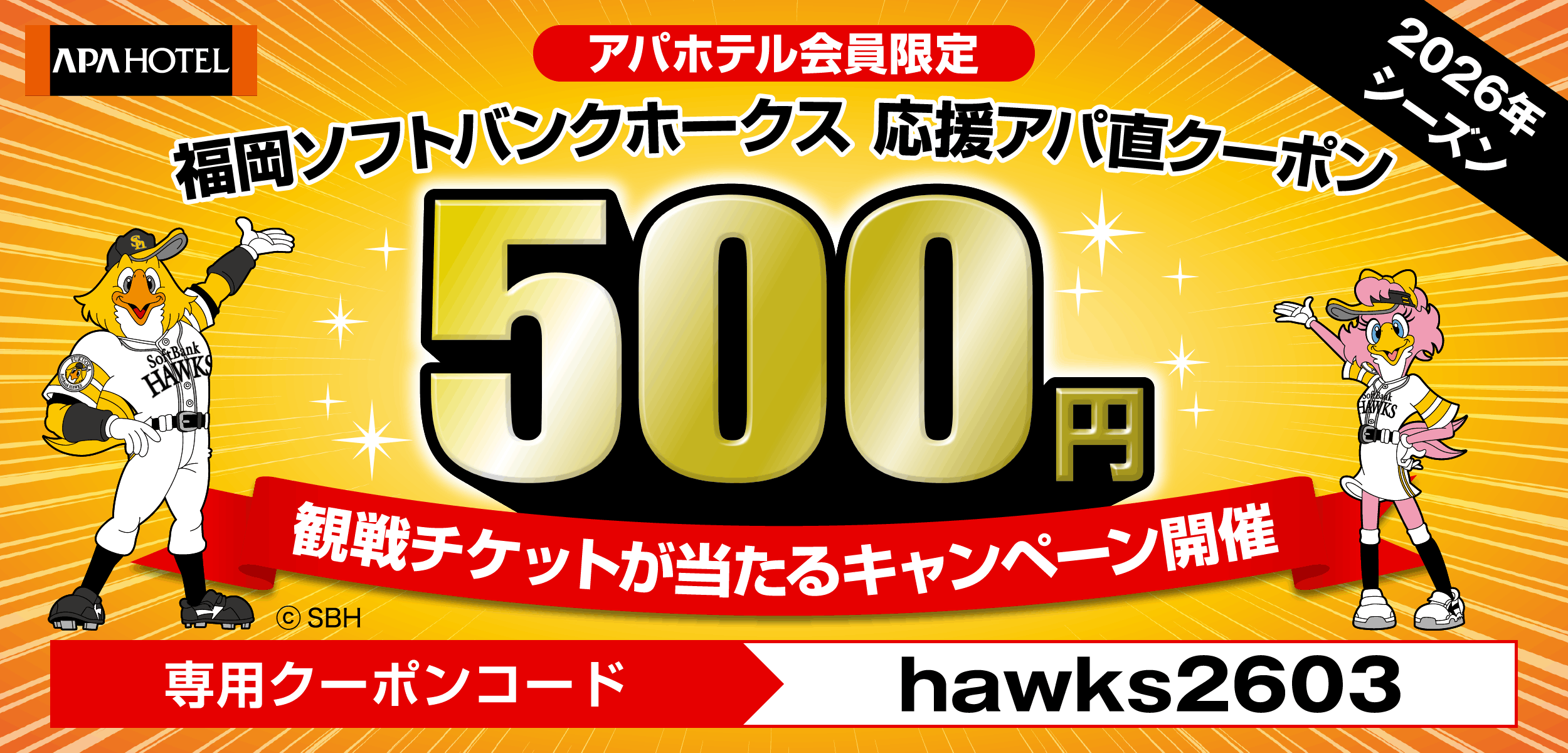 サイト上部でクーポンコードを確認、アパアプリをダウンロード⇒ログイン後、クーポンコードを入力することで【福岡ソフトバンクホークス応援アパ直クーポン】を取得できます。クーポンは「アパ直(公式サイト・アプリ)」からアパホテルを予約する際に500円割引となります