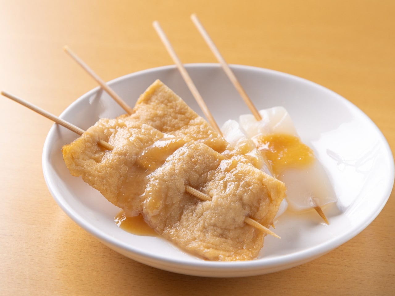 すりおろした生姜と味噌を混ぜ合わせたタレをのせたおでんです。戦後、青森駅前周辺に出来た屋台の1軒が、冬の厳しい寒さの中、青函連絡船に乗り込もうとするお客様に少しでも暖まって欲しいとの思いで作ったのが喜ばれ、広まったと言われています。