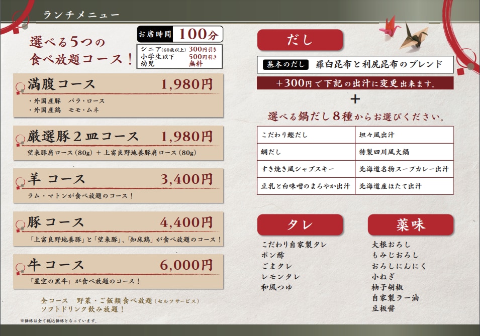 選べる5つの食べ放題コースでご提供いたします。【お席時間100分】