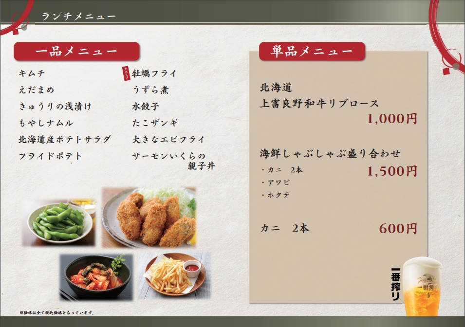 バラエティ豊かな一品メニューや、しゃぶしゃぶでお召し上がりいただけるかにやアワビを盛り合わせた海鮮しゃぶしゃぶや、北海道上富良野和牛リブロースをご用意いたしました!