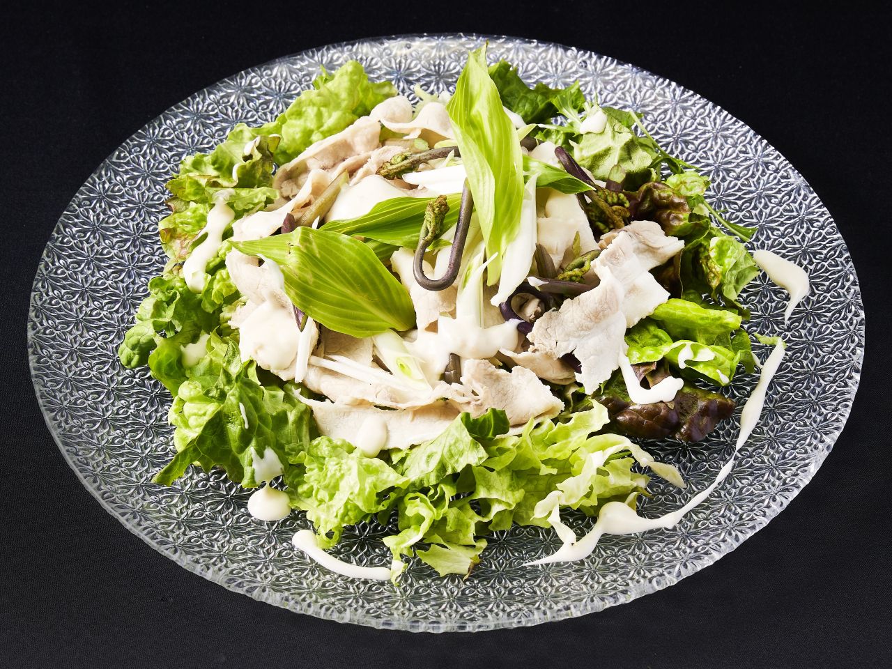 旬の山菜を能登豚のしゃぶしゃぶと共にサラダにします。