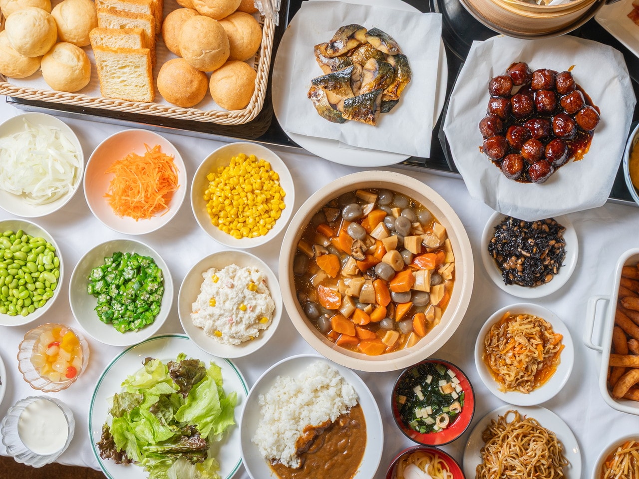 - ごはん、パン、スクランブルエッグ、焼きそば、カレー、氷見うどん、ソーセージ、焼き魚、かまぼこ、小皿、煮物、サラダ、ドリンク類etc