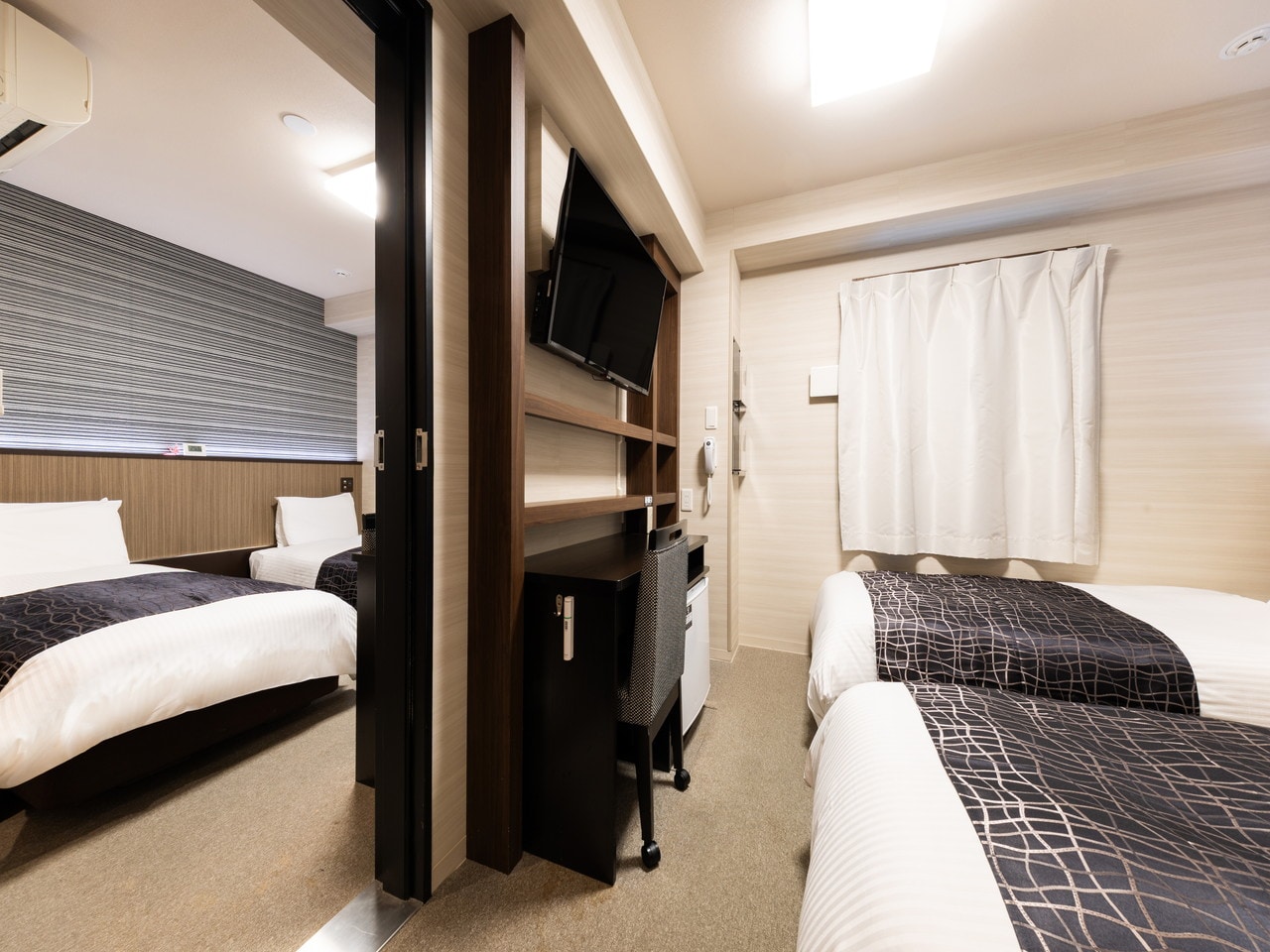 コネクトツインルーム 広さ22㎡/ベッド幅140cm×2台。隣同士で空間シェア:隣接内扉(コネクティングドア)を開放し隣り合った客室間を自由に往来可能