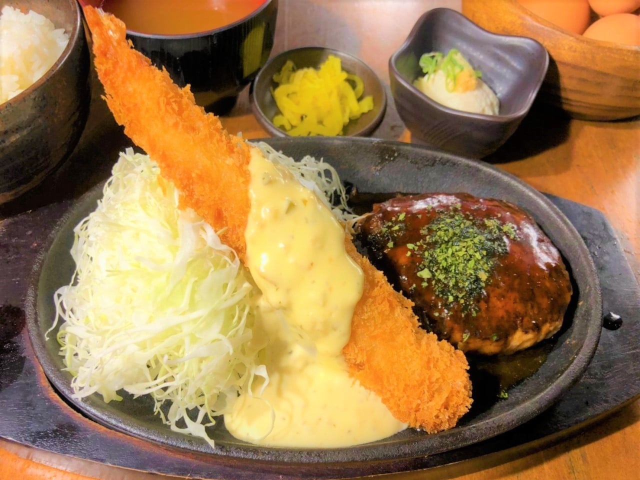 大きなエビフライとジューシーなハンバーグのボリューム満点な定食です。