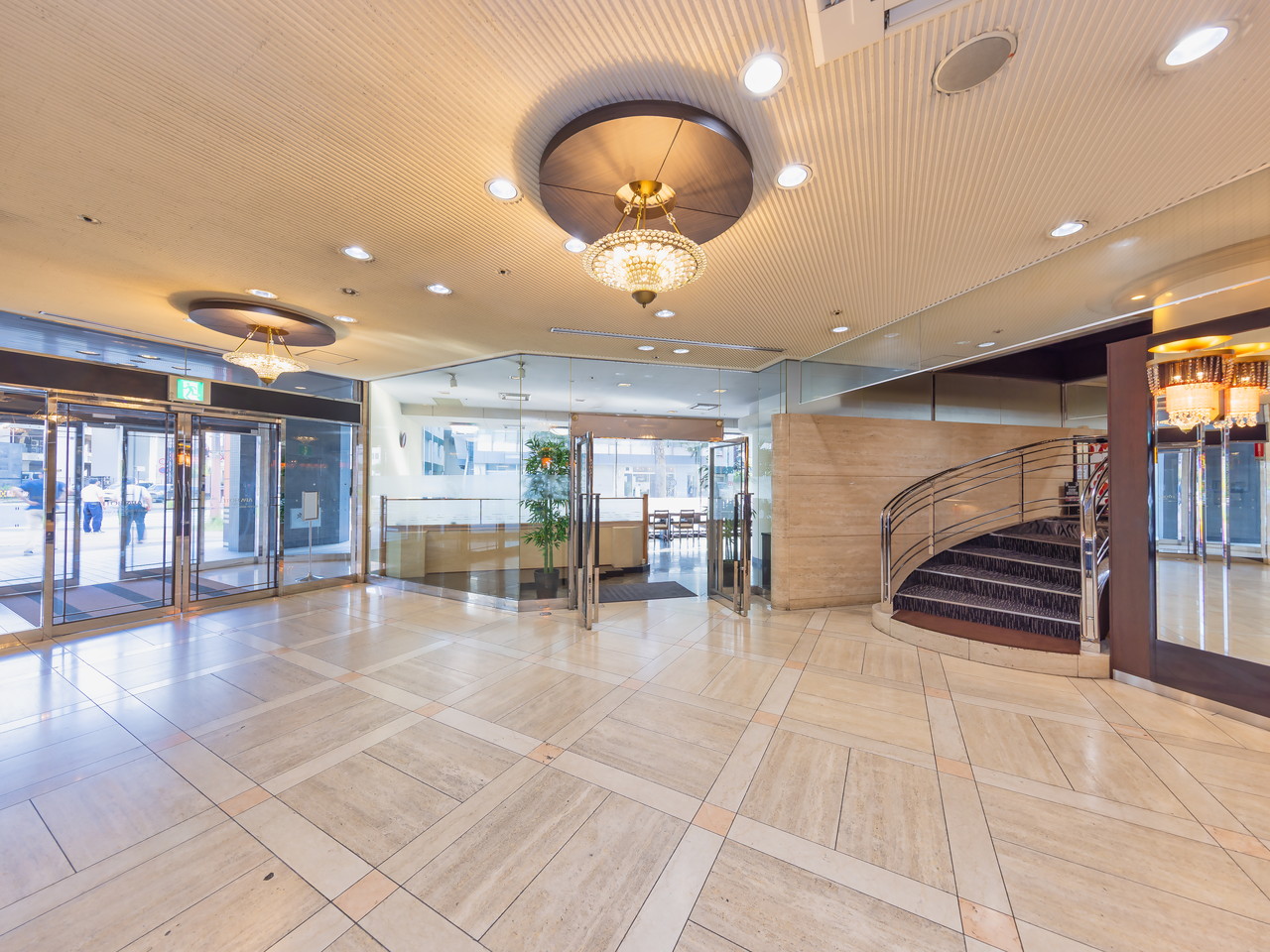 左手にアパホテル〈小倉駅前〉の看板があり白い建物が当館でございます。