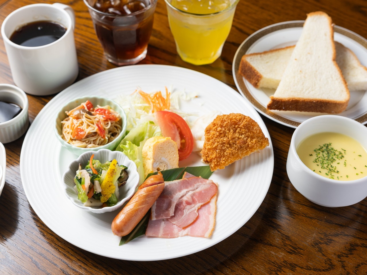 和食 or 洋食選択セットメニュー。 和定食【ごはん・味噌汁・焼き魚(日替わり)・卵焼き・フライ・小鉢・サラダ・お漬物】 洋定食【トースト・フライ・卵焼き・ウィンナー・小鉢・サラダ・スープ】 |