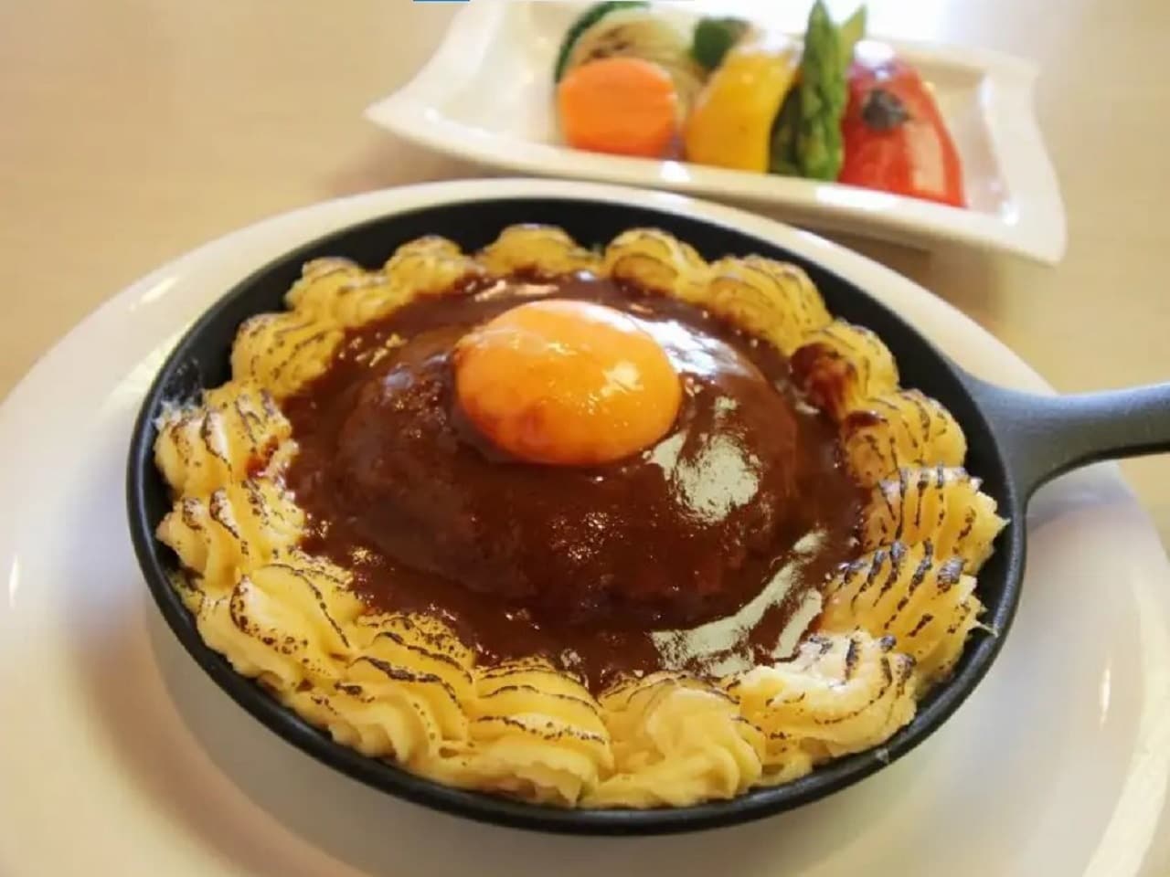 南部鉄器の鉄鍋で焼き上げたハンバーグ デミグラスソースたっぷりで