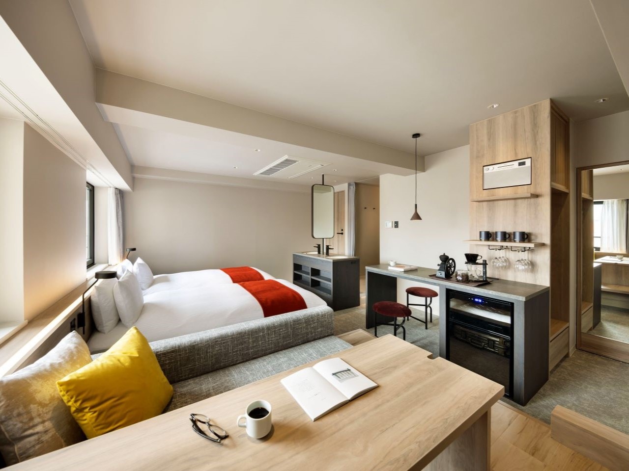 31平米/110㎝×195㎝×2台+エキストラベッド×1台/禁煙/広めのバスタブ/浴室TV/バストイレ別/独立洗面台/小上がりリビング/ミニバーカウンター/ワインセラー付冷蔵庫/ハンドトリップコーヒーセット
