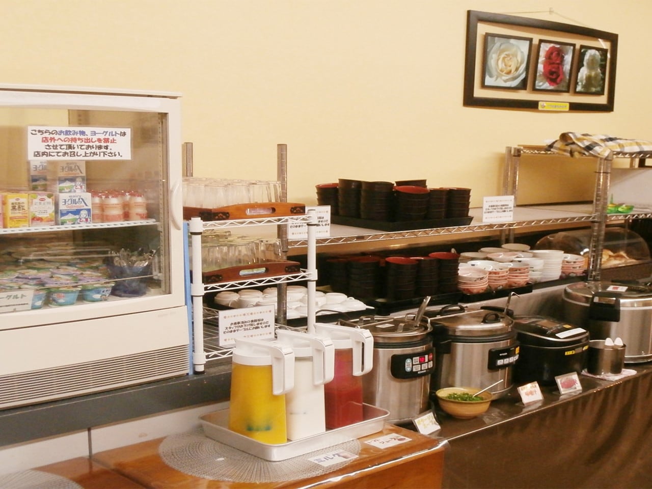 - ごはん/お味噌汁/焼鮭/ウィンナー/湯豆腐/肉団子の カレー風味/きんぴらごぼう/スパゲッティサラダ/ 野菜サラダ/ハム/卵焼き/さつまあげ/焼海苔/漬物/ 梅干/トマトスライス /スープ牛乳/オレンジジュース トマトジュース/コーヒー/季節のフルーツetc