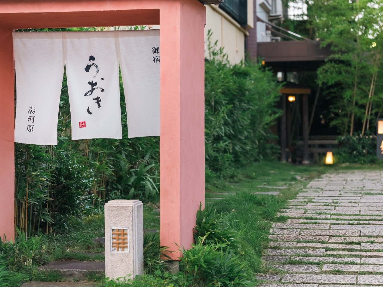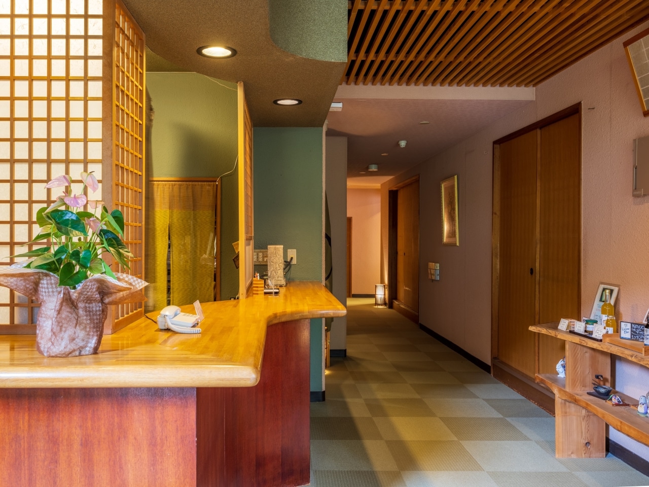 風情ある暖簾と石畳の小道が迎える和の趣。竹林に囲まれた門構えには、ほのかな灯りと粋な看板が輝き、静寂な佇まいが心和ませる外観です。 明るい光が差し込むフロントとロビーは、落ち着いた雰囲気でお過ごしいただきやすい空間を演出。 和モダンな設えが、くつろぎのひとときを約束します。