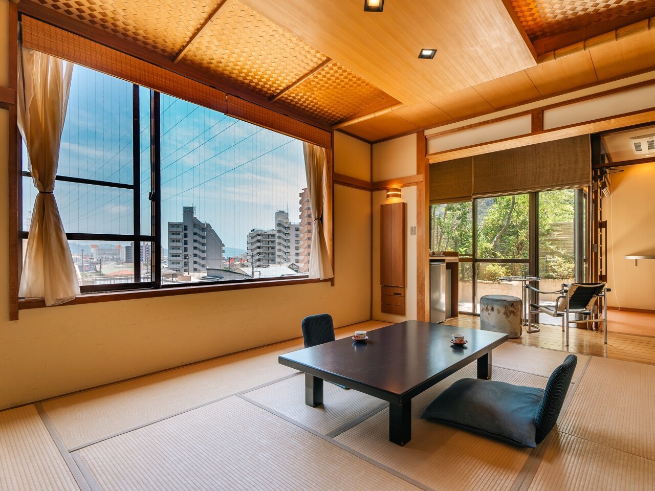 定員:1〜4名 広さ:10畳+露天風呂 源泉かけ流しの檜露天風呂付きの客室 開放的な空間に配されたベッドで快適な眠りを。和の趣と現代的な寛ぎを調和させたお部屋です。