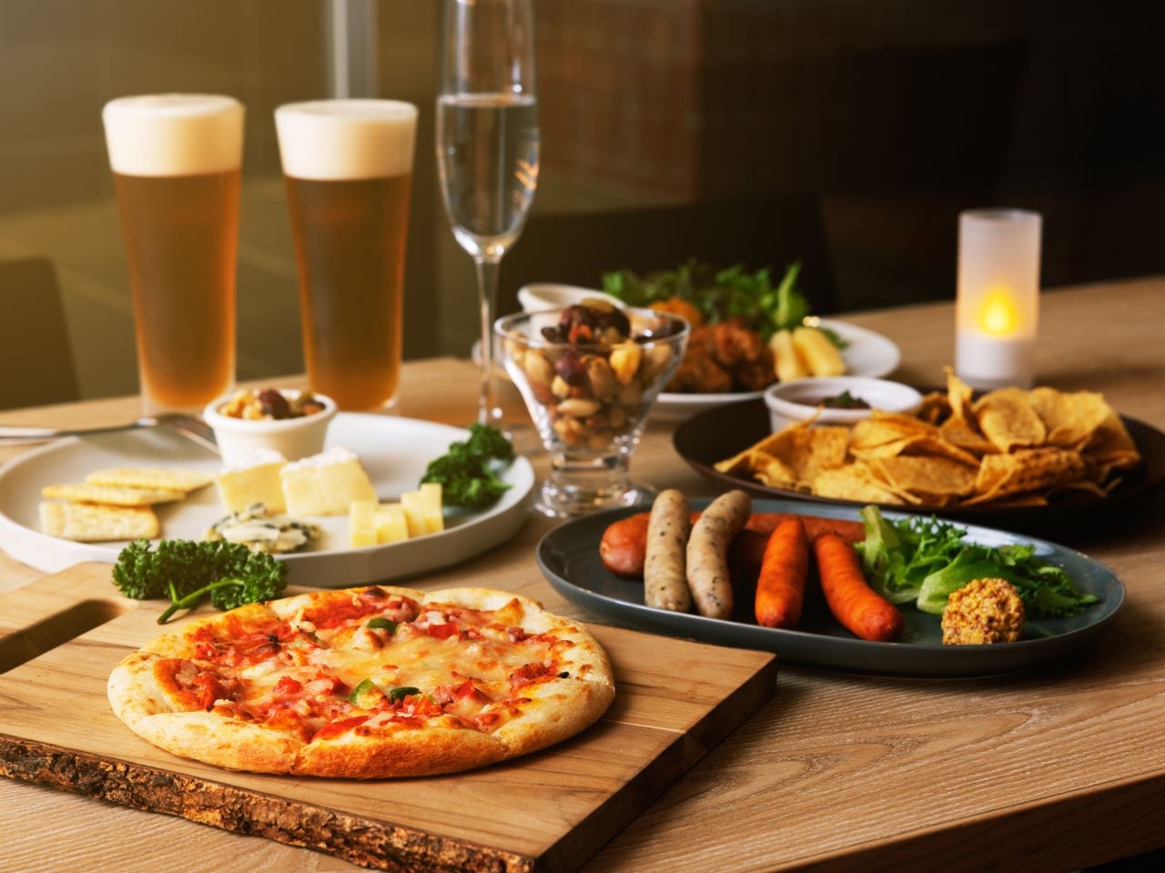 - フード:ミックスナッツ、トルティーヤ、ソーセージの盛り合わせ、ピザ、キッシュ ドリンク:キリン 一番搾り、各種クラフトビール、 日本酒、ワイン