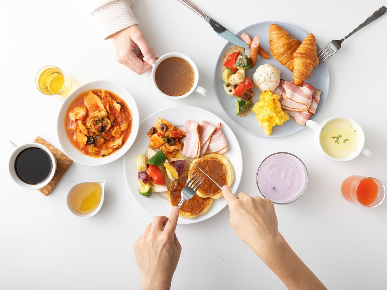選び抜かれたパン、スクランブルエッグ、ソーセージ、彩り豊かな温野菜。必要なものだけを上品に揃えた、コンパクトな洋食ブッフェです。専用マシンで焼き上げる、フレッシュなパンケーキもご用意。ボタンひとつで、焼き立ての美味しさをお楽しみいただけます。