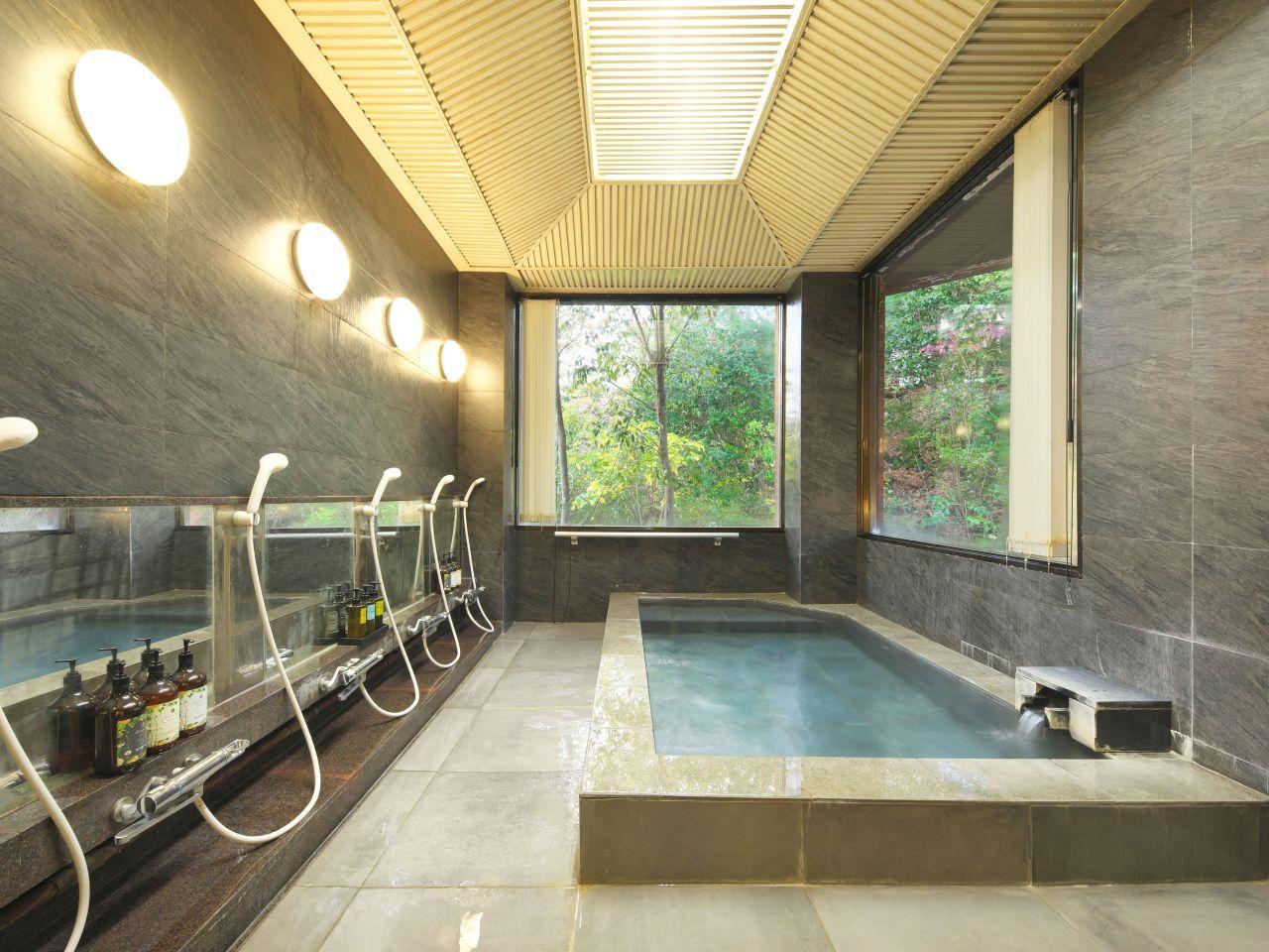 キングベッドのある開放的なリビングフロアーと、寛ぎの4畳の和室を備えた客室。和の落ち着きと洋の快適さが調和した44.8㎡の贅沢な空間です。リビングフロアーの窓からはテラス越しに豊かな緑と、その先には相模湾と伊豆大島が臨めます。また温泉が苦手な方にもお愉しみいただける、ゆったりとしたバスルームを完備。心躍る特別なひとときをお過ごしいただけます。