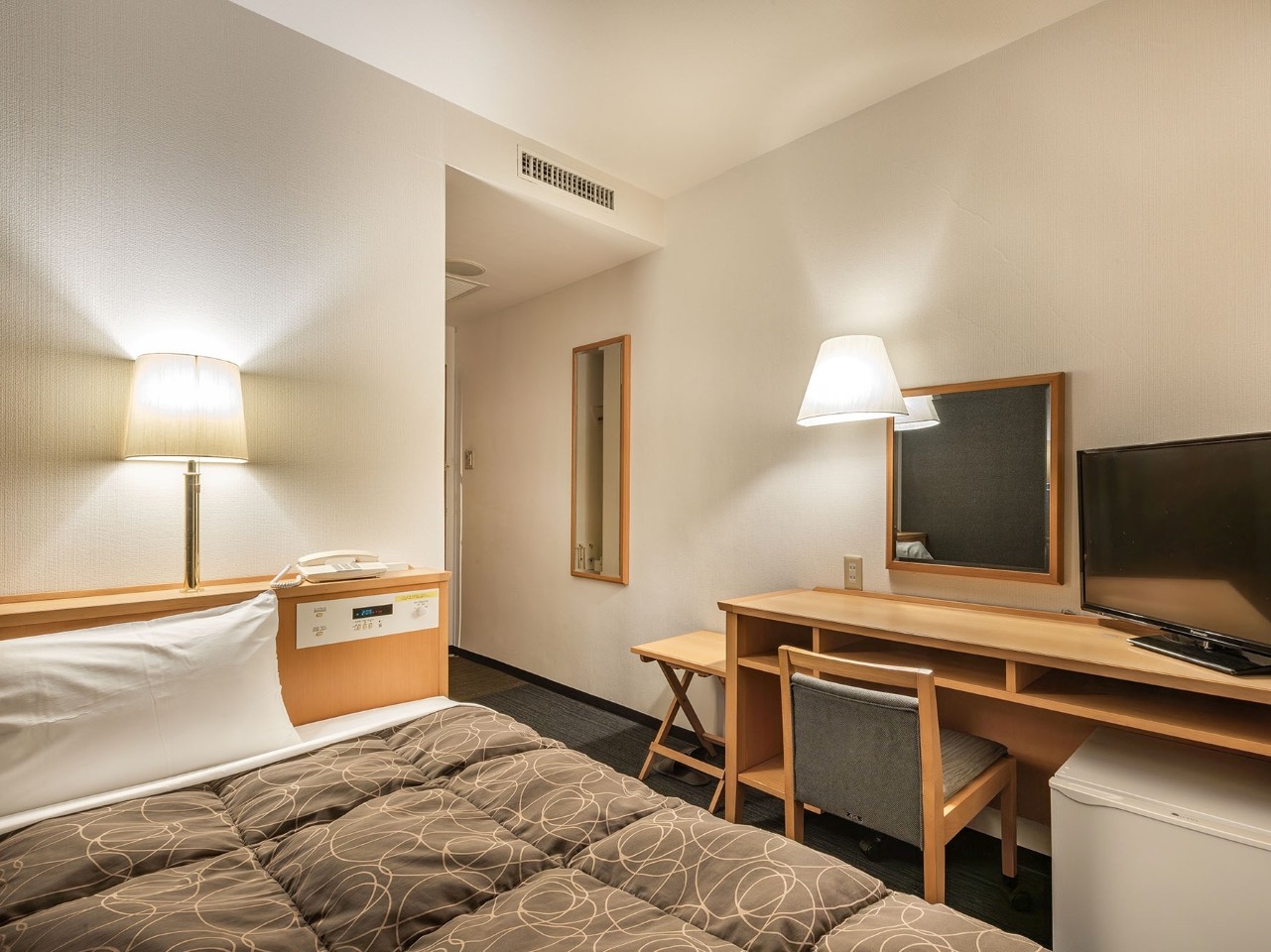 当ホテルのスタンダードルームです。広さ12㎡/ベッド幅123cm ベッドは固めのものを使用しておりますので、お休み時に体が沈みこみすぎることがなく、やわらかいベッド特有の腰の痛みがありません。