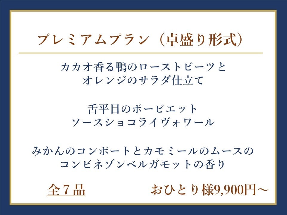 | プレミアムプラン | 着席卓盛り形式 おひとり様/9,900円(税込)~ 【30名様~】 |