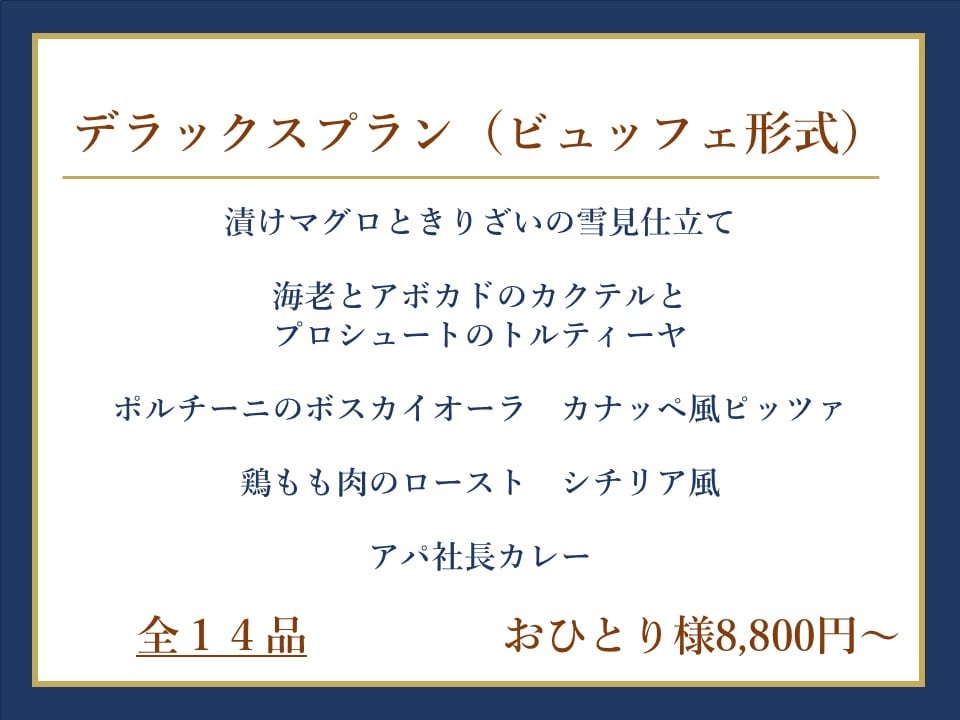 | デラックスプラン | ビュッフェ形式 おひとり様/8,800円(税込)~ 【30名様~】 |