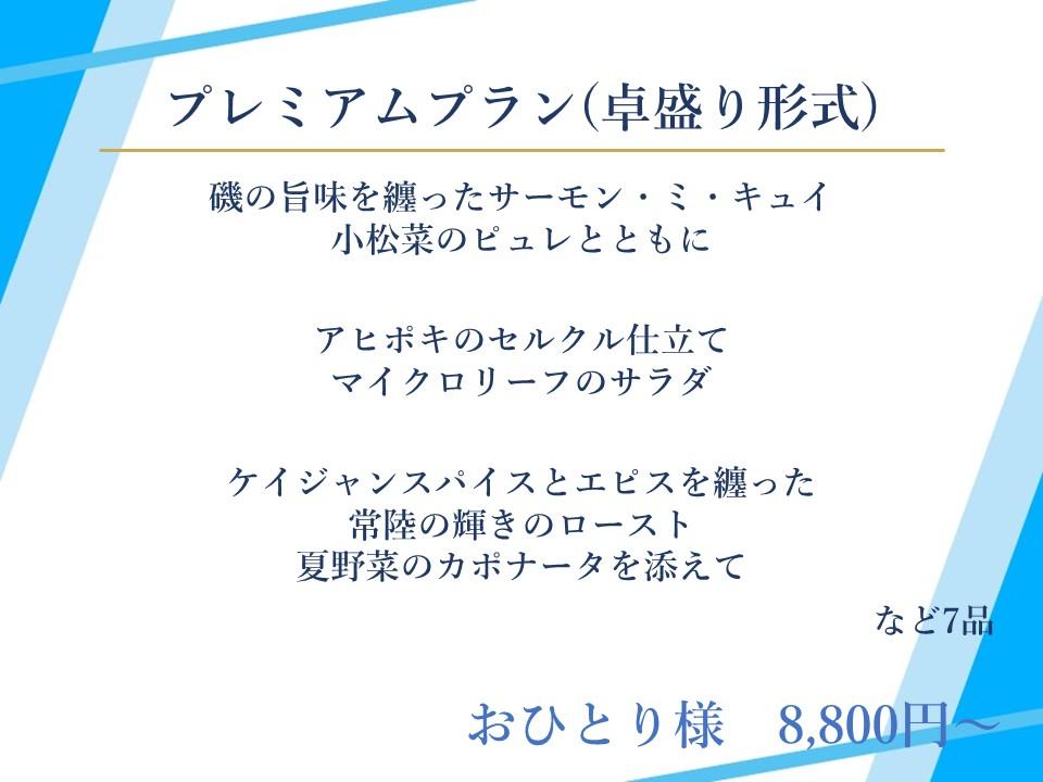 | プレミアムプラン | 着席卓盛り形式 おひとり様/8,800円(税込)~ 【30名様~】 |