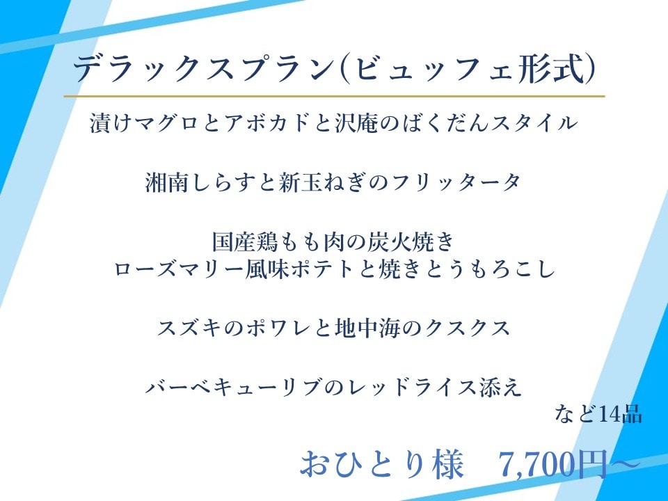 | デラックスプラン | ビュッフェ形式 おひとり様/7,700円(税込)~ 【30名様~】 |