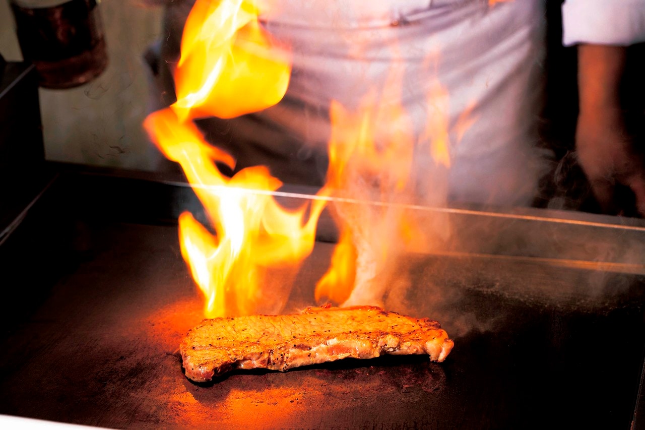 目の前でシェフが調理するライブキッチンでは、牛ロースステーキや熱々の揚げたて天ぷらが大人気!