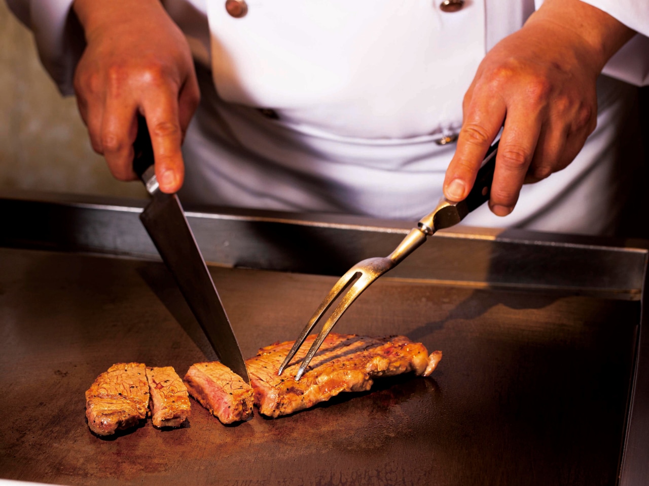 ディナータイムは牛ロースステーキをカットサービスにてご提供いたします。