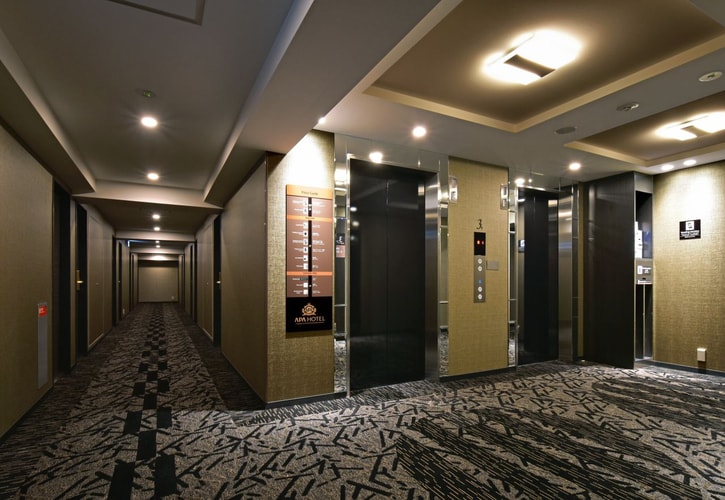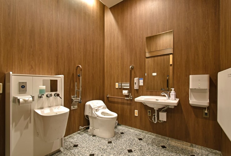 1Fロビーに多目的トイレを設置しております。入り口は80cm以上の幅を確保しています。