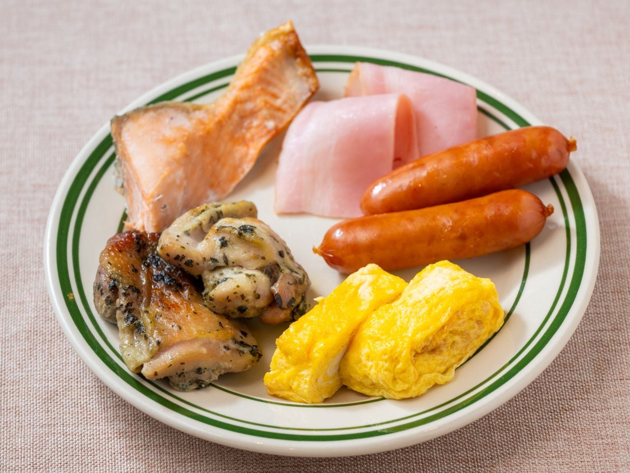 ソーセージ、ハム、卵焼きや日替わりで焼き魚が変わります。