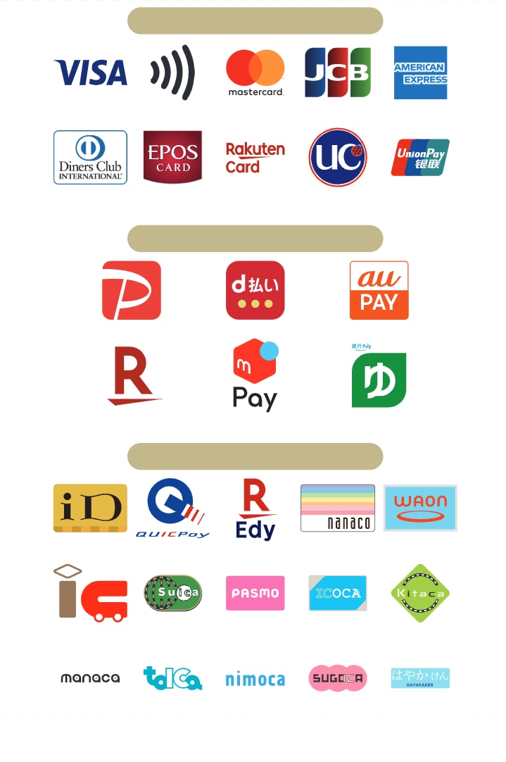 | 支払方法(現金以外) | VISA、MasterCard、JCB、アメリカン・エキスプレス、ダイナースクラブ、MUFG、UC、DC、NICOS、UFJ、スマホ決済(R Pay、au Pay、d払い、Pay Pay、ゆうちょPay、M Pay、Jcoin、)電子マネー(ID、QUICPay、楽天Edy、nanaco、WAON、Suica、PASMO、ICOCA、Kitaca、manaca、toica、nimoca、sugoca)※2025年3月末をもってPINバイパス(暗証番号入力スキップ)が原則廃止されております。 |