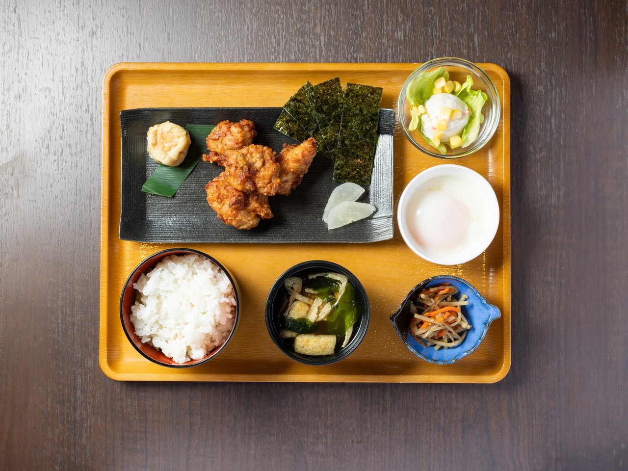 唐揚げ、温泉卵、のり、焼売、ポテトサラダ、漬物、ご飯、みそ汁、小鉢