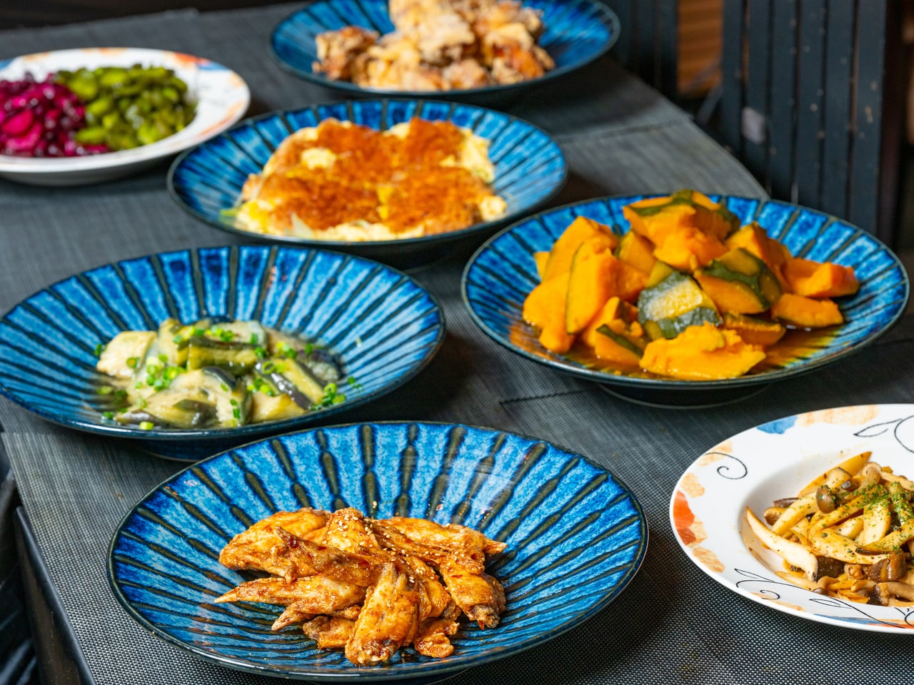 和食ビュッフェ一例(カツ煮・茄子の揚げびたし・かぼちゃの煮物・柴漬け・青きゅうり)