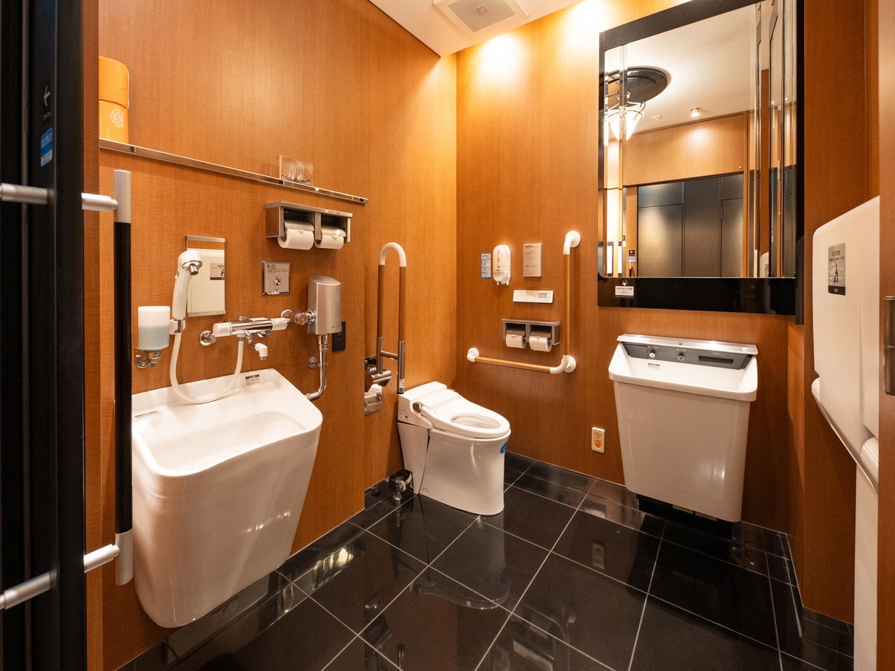 1階ロビーに多目的トイレを設置しております。入り口は80cm以上の幅を確保しています。