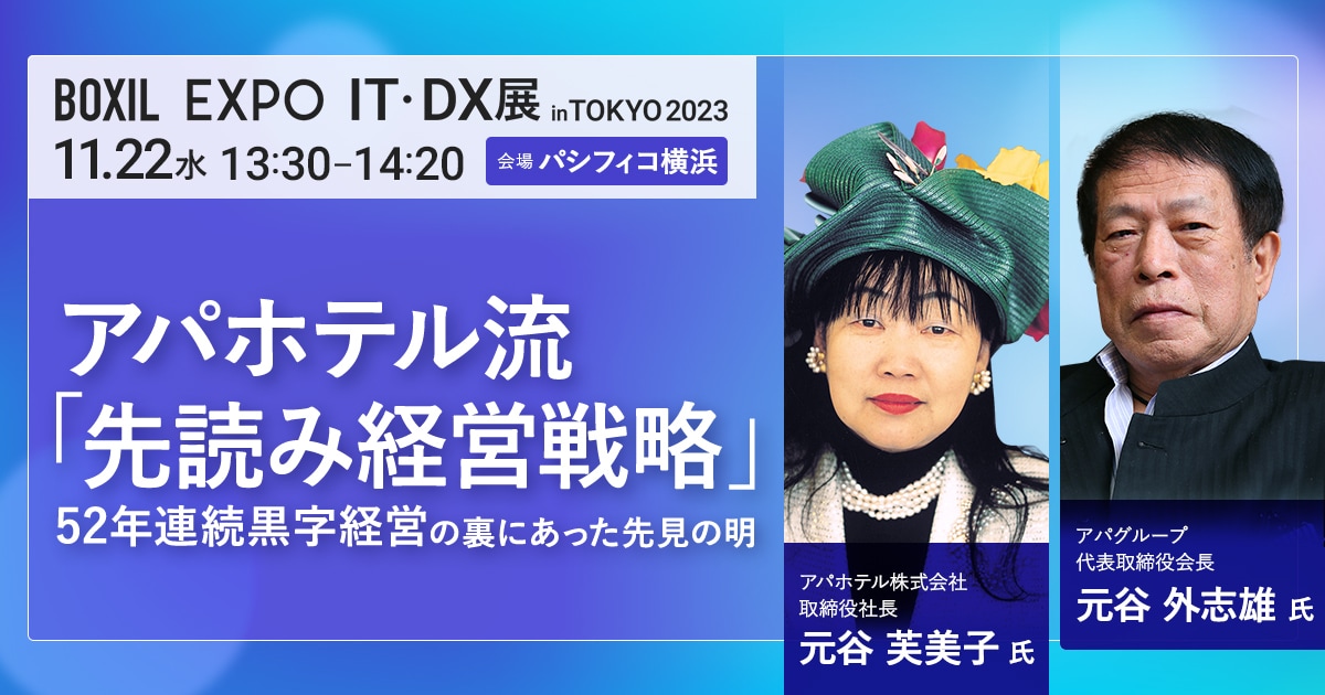 スペシャルコンテンツ 2023年10月26日(木)BOXIL EXPO(ボクシル エキスポ) IT・DX展 in TOKYO 2023にアパグループ代表取締役会長 元谷外志雄とアパホテル株式会社取締役社長 元谷芙美子が講演ゲストとして出演致します。