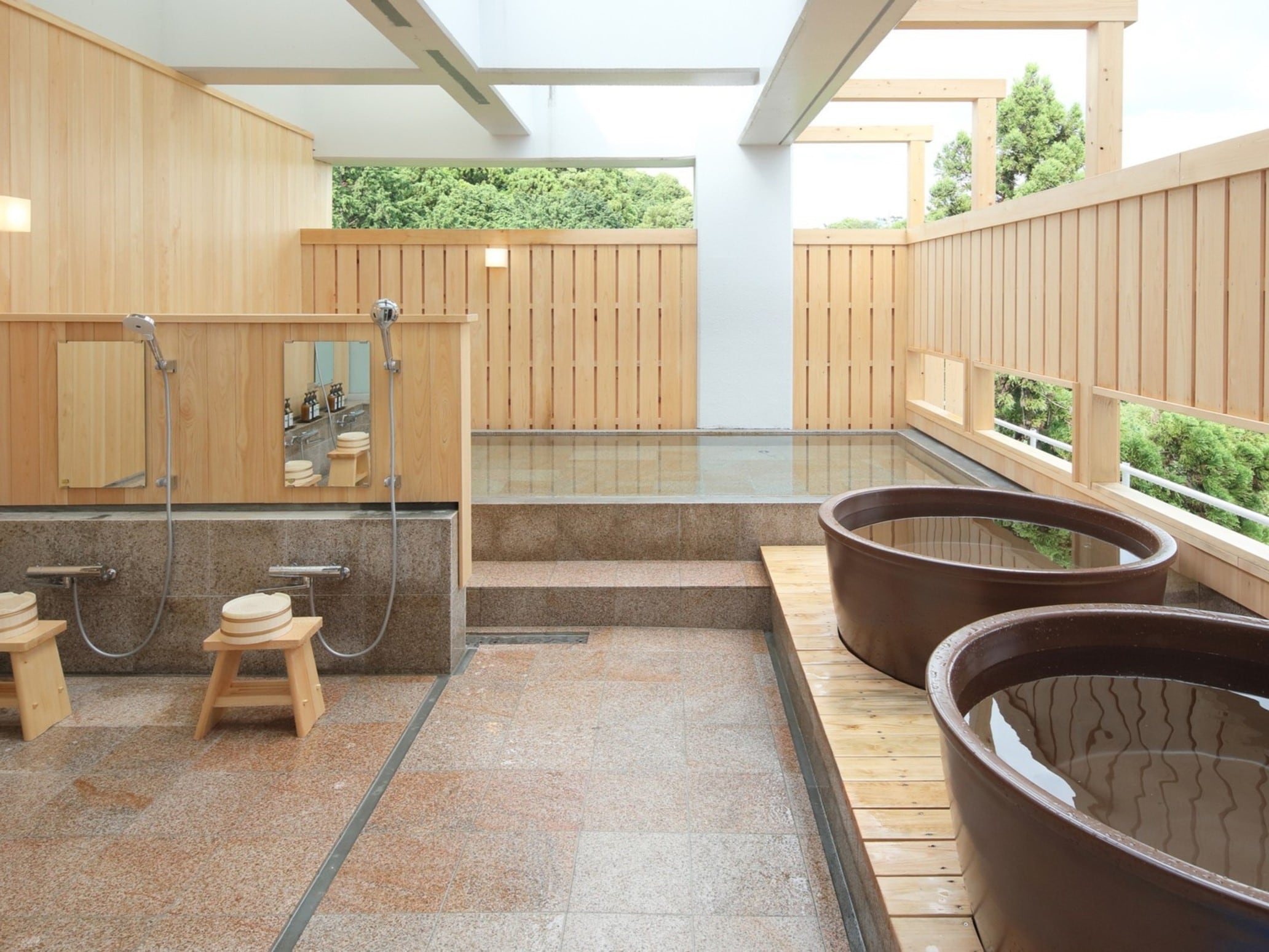 江戸時代の徳川家康も気に入ったと言われる熱海温泉を引いており、その効能は関節痛・冷え性・腰痛に効くとされています。スイートルーム備え付けの専用露天風呂に加え、半露天風呂「天空」や貸切風呂「蒼」で熱海の名湯をお楽しみください。「天空」では男女入替制で1つは熱海の自然を望むフォレストビューを、もう片方は熱海湾を望むシービューをお愉しみいただけます。貸切風呂「蒼」の予約は当日ご到着のお客様から順番で承っております。