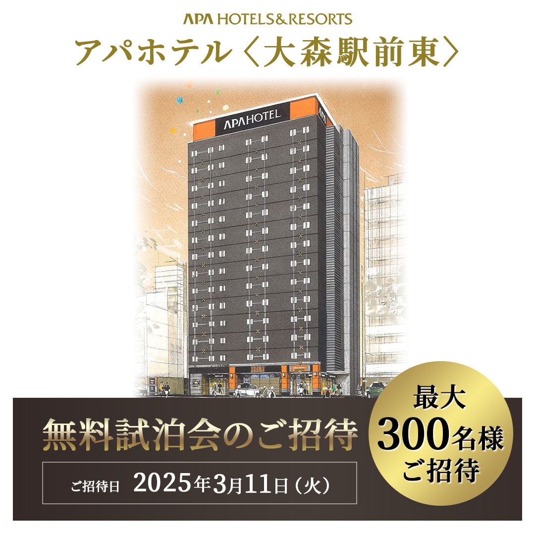 イベント 2025年01月17日(金)2025年3月17日(月)のオープンを記念して『無料試泊会(素泊まり) 』を2025年3月11日(火)に開催します。応募者の中から抽選で最大300名様を御招待します。さらに、アパアプリから応募いただくと、次回予約時に使える「100ポイントクーポン」をもれなくプレゼント!