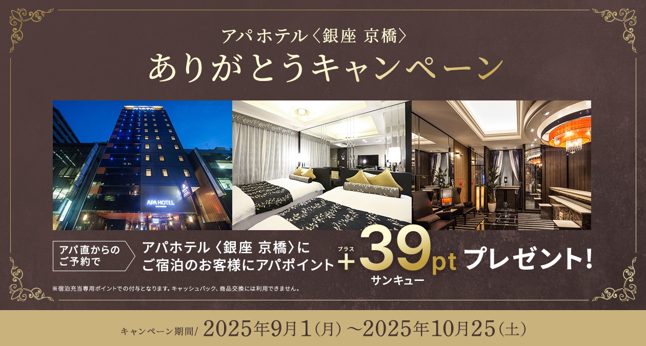 これまでの感謝の気持ちを込め、期間中、アパ直からのご予約でアパホテル〈銀座 京橋〉にご宿泊いただいたお客様に、アパポイントを39ptプラスでプレゼントいたします!