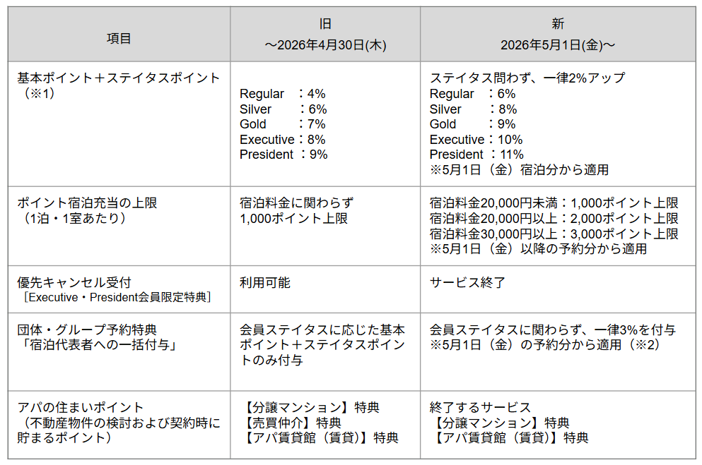 このたびアパホテルでは、さらなる利便性と顧客満足度の向上を目的として、2026年5月1日(金)より会員制度の一部内容を改定いたします。