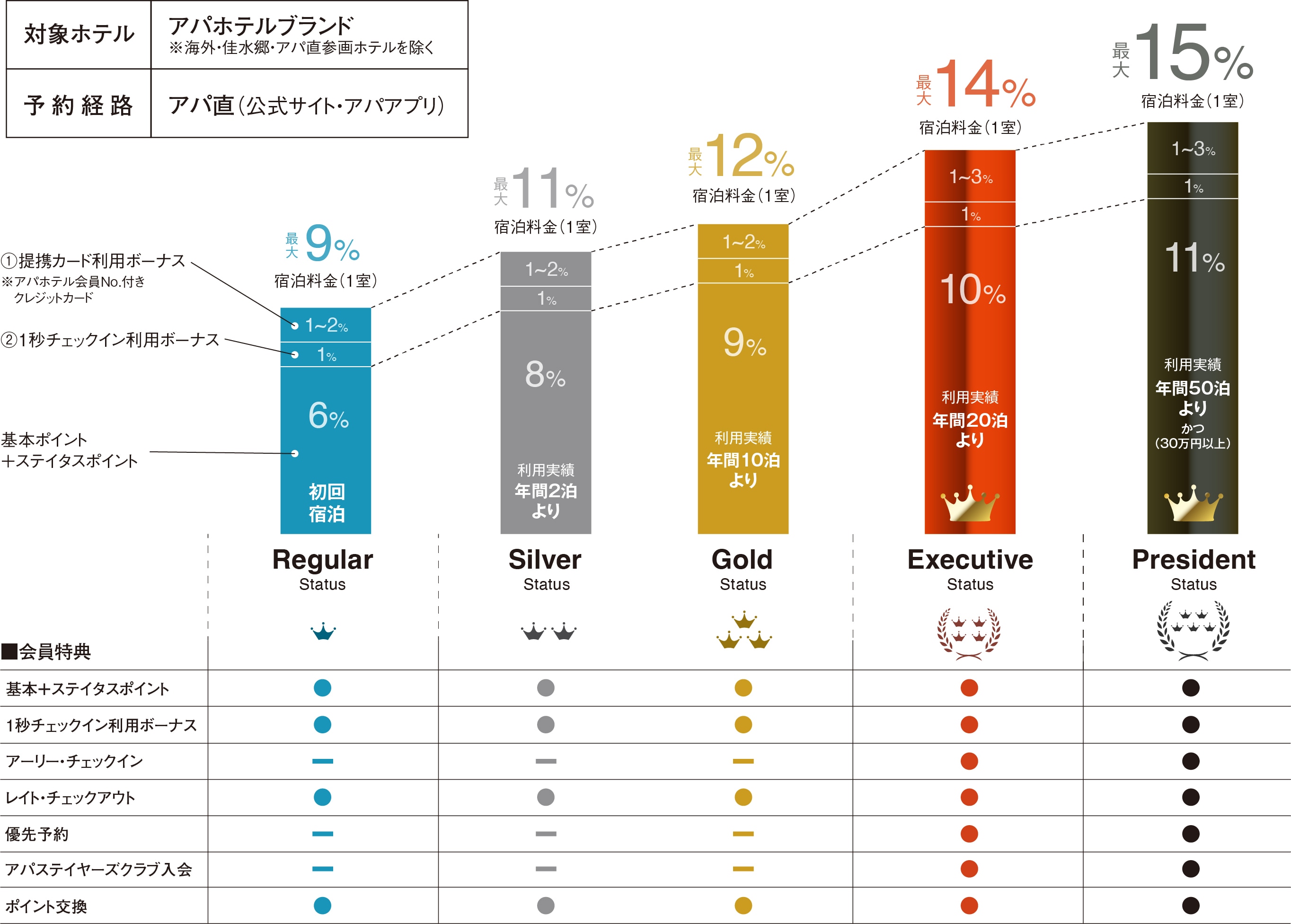 全ステイタスにおいて、オンライン予約ボーナス(1%)とオンライン支払ボーナス(1%)を終了する代わりに、基本ポイント+ステイタスポイントを一律2%アップいたします。