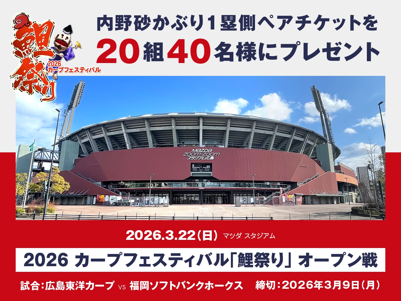 キャンペーン 2026年02月13日(金)2026カープフェスティバル「鯉祭り」内野砂かぶり1塁側を20組40名様にプレゼント!
