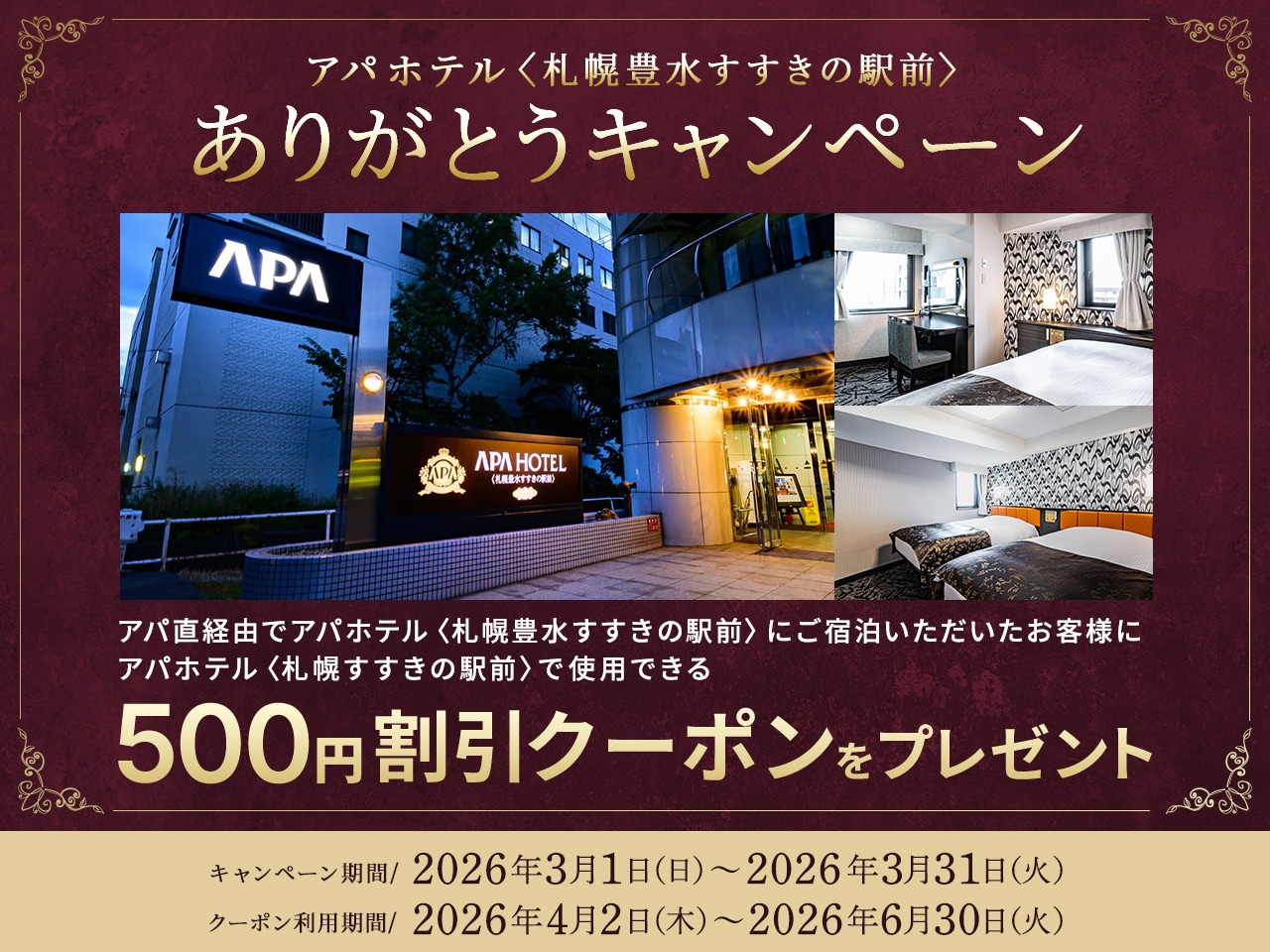 これまでの感謝の気持ちを込め、期間中、アパ直からのご予約でアパホテル〈札幌豊水すすきの駅前〉にご宿泊いただいたお客様に、アパホテル〈札幌すすきの駅前〉の500円割引アパ直クーポンをプレゼントいたします。