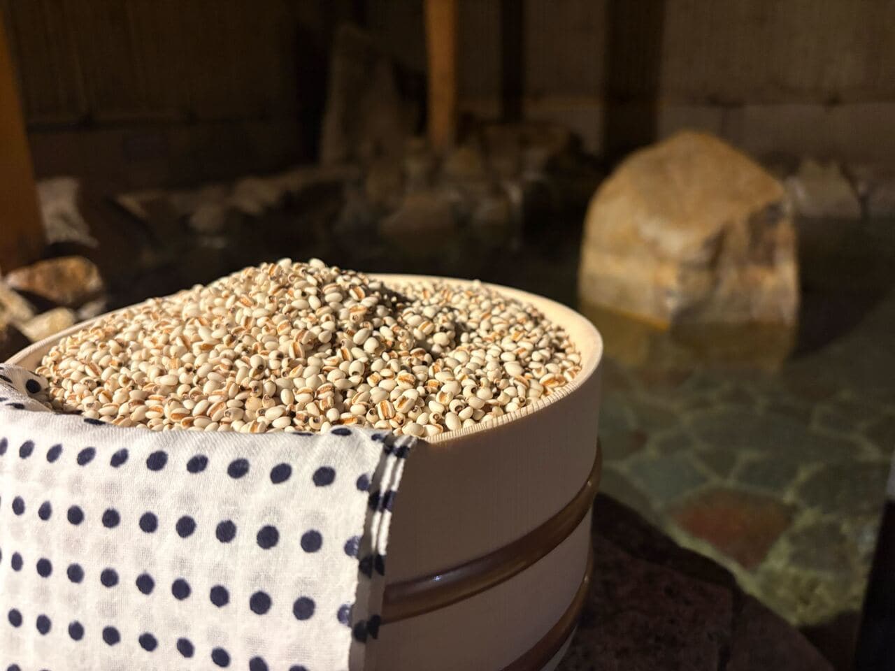 2月21日から2月27日の期間限定で、当館各大浴殿の一部露天風呂にてハトムギ湯を実施いたします。