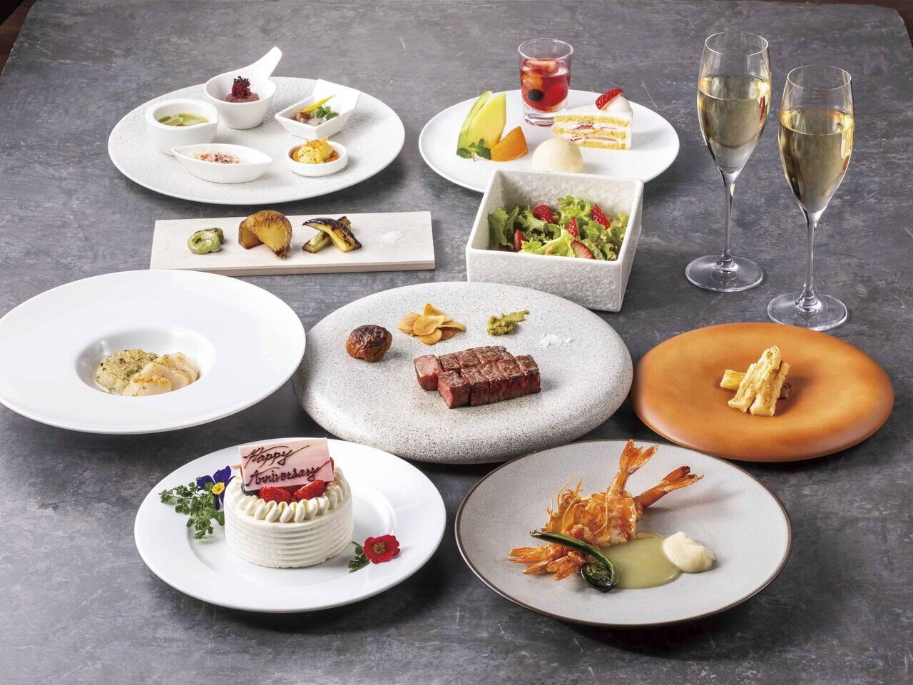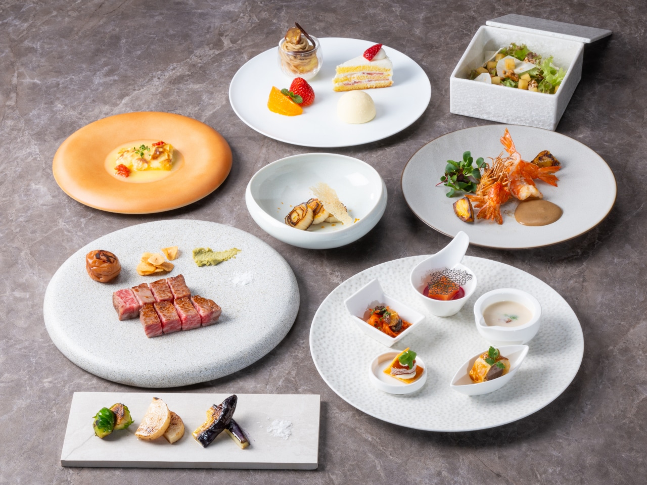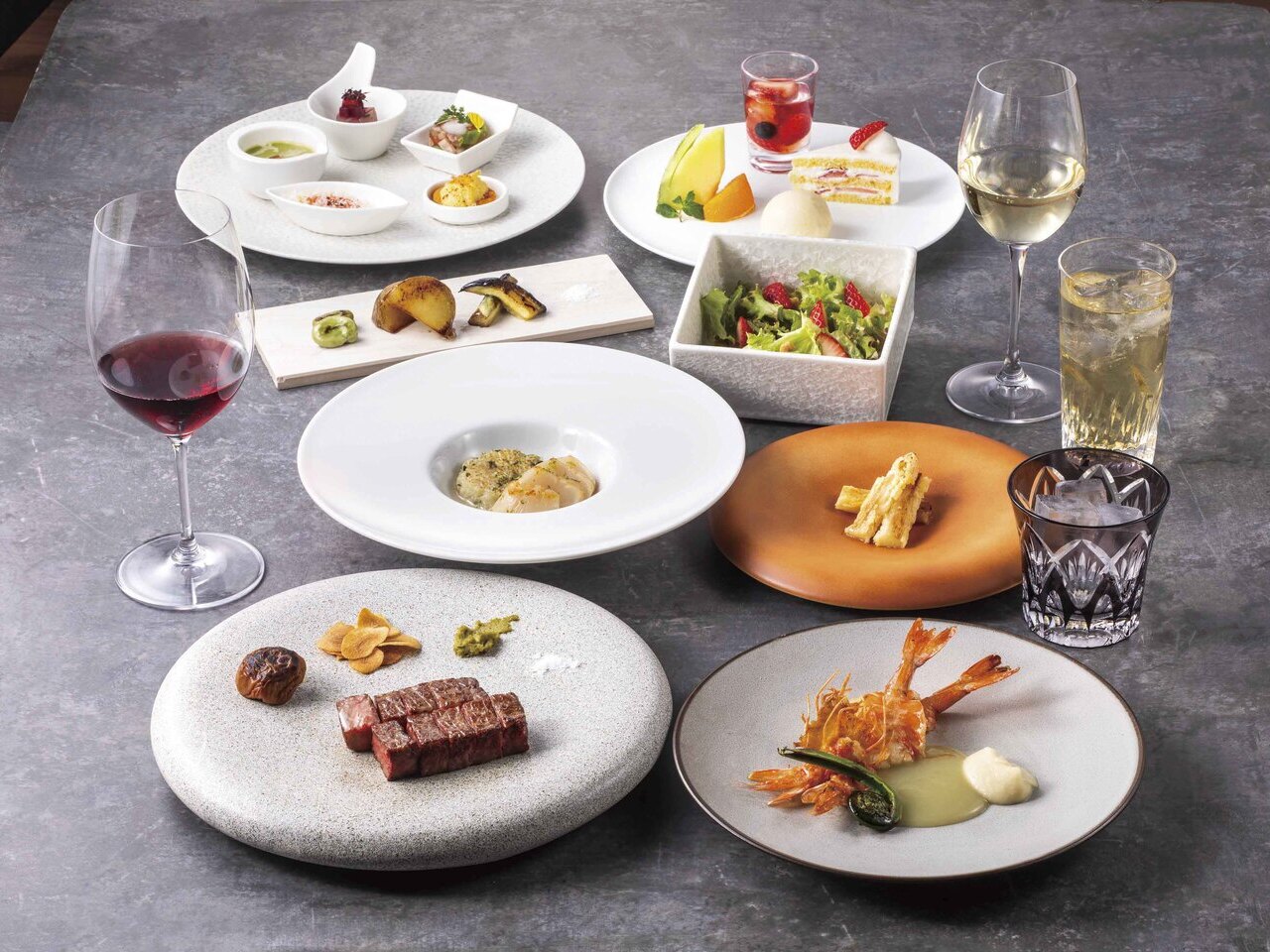 ・前菜五品「en」・刻の野菜の鉄板一品・季節の温前菜・フレーバーサラダ・季節の鮮魚の鉄板焼・A5ランク銘柄牛ロース肉 (100g)・季節のこだわり焼き野菜/焼き梅干・白飯orアパ社長カレー(お茶碗)or日本一こだわり卵を使った卵かけご飯サルタート・海老香る出汁味噌汁/香の物・選べるデザートワゴン2種・コーヒー 又は 紅茶
