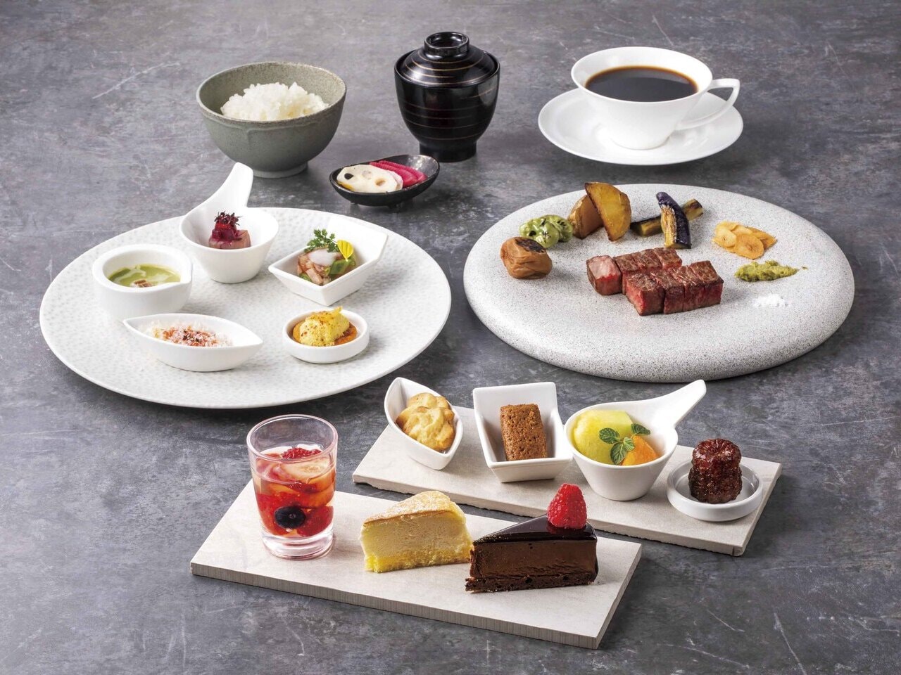 ・前菜五品「en」・フレーバーサラダ・A3ランク黒毛和牛ロース100g (100g)・季節のこだわり焼き野菜/焼き梅干・白飯/海老香る出汁味噌汁/香の物・季節のデザート・コーヒー 又は 紅茶