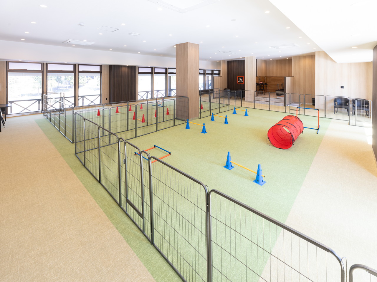 上越妙高の豊かな自然の中、天候を気にせず遊べる**「屋内ドッグラン」**がオープンいたしました。約200㎡の広々とした空間に、アジリティやフォトスポット、ケア設備も完備しております。