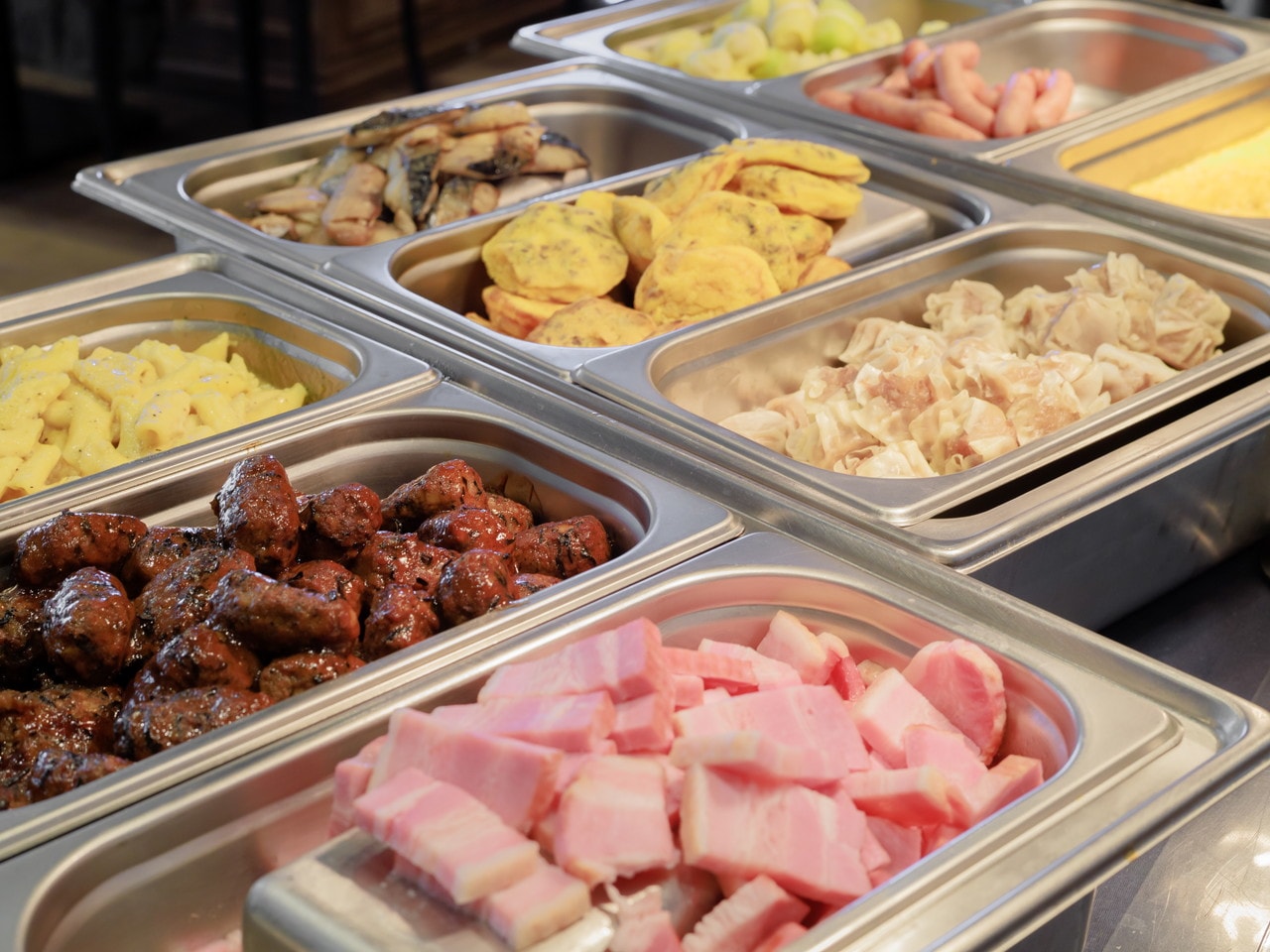 ■洋食は、本格パスタ2種(ナポリタン+日替わり)や粗びきソーセージ、スクランブルエッグ、焼き立てのフレンチトーストやクロワッサンもご用意。セルフクッキングでは、地鶏の生卵をそのまま卵かけごはんか、目玉焼きにもでき、あっさり醤油ラーメンもあります。サラダバイキングは6種類からたっぷりと盛り付けができ、フルーツカクテル、ヨーグルト、ミニケーキも並びます。香りの良い豆挽きコーヒーもどうぞ。