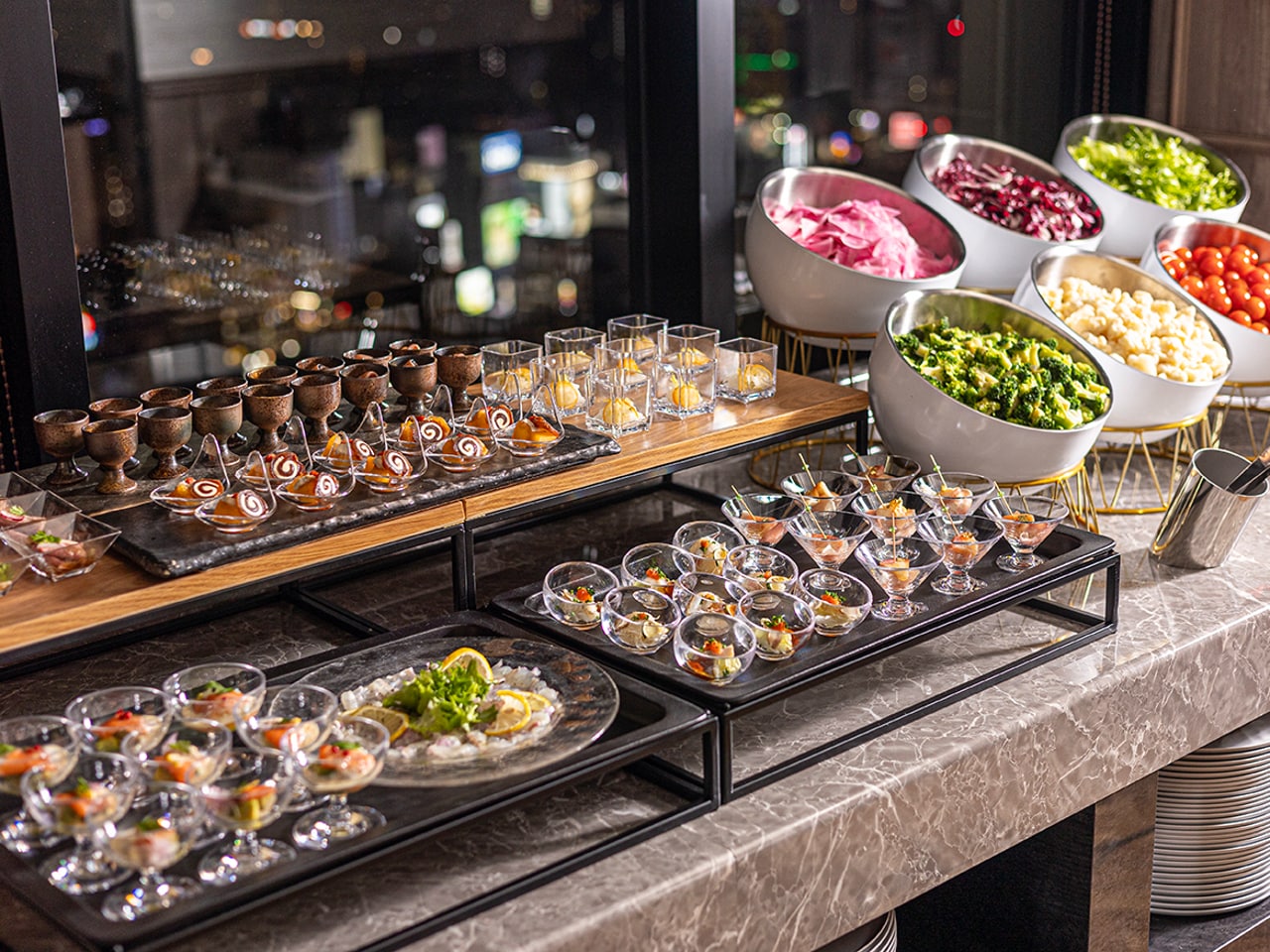 熟練の和食職⼈や唎酒師などプロが織りなすモダンな和食のプレミアムビュッフェと、夜景を楽しみながら開放感のあるひと時をお楽しみください。
